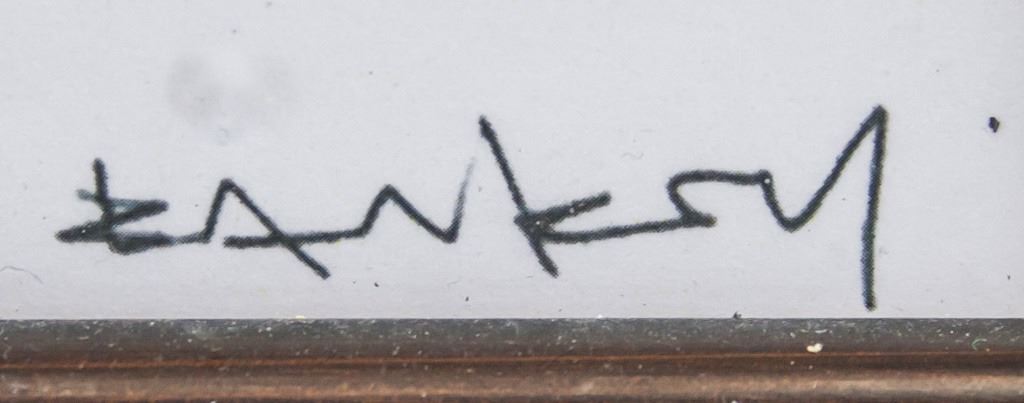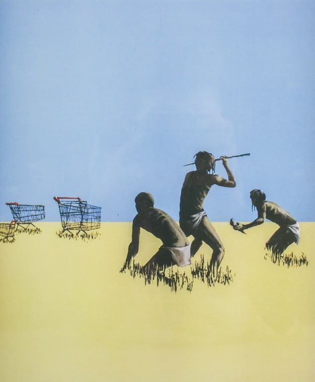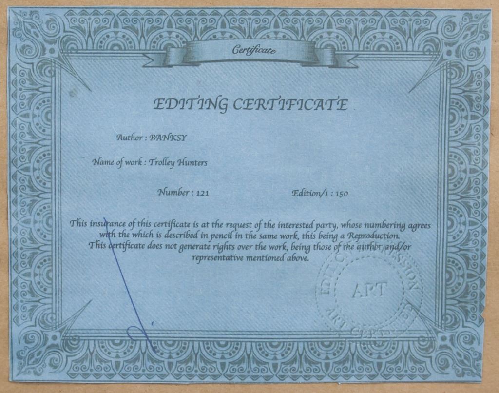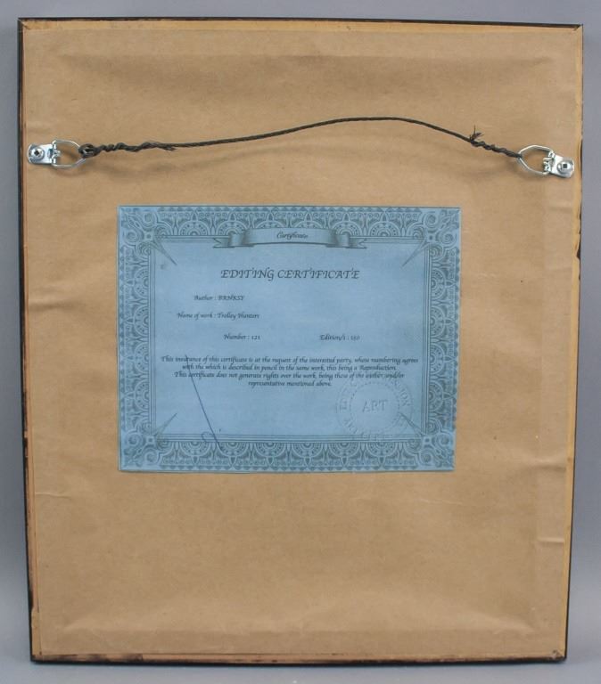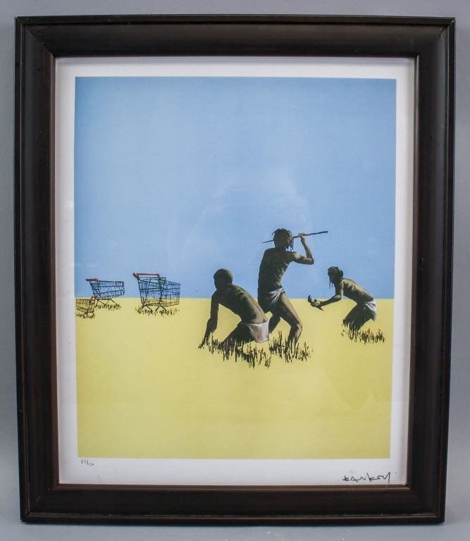 Print on paper, framed. Featuring three figures hunting down some shopping trolleys in a field. "BANKSY" signed in block to the bottom right corner. "121/150" printed to the bottom left corner. Editing Certificate on verso. 26 x 30 cm (10 x 12 in), Frame: 36 x 30 cm (14 x 12 in).