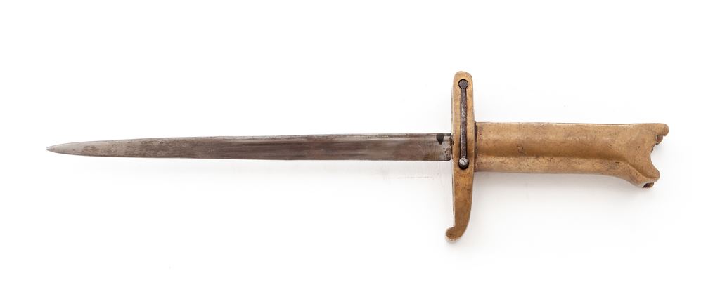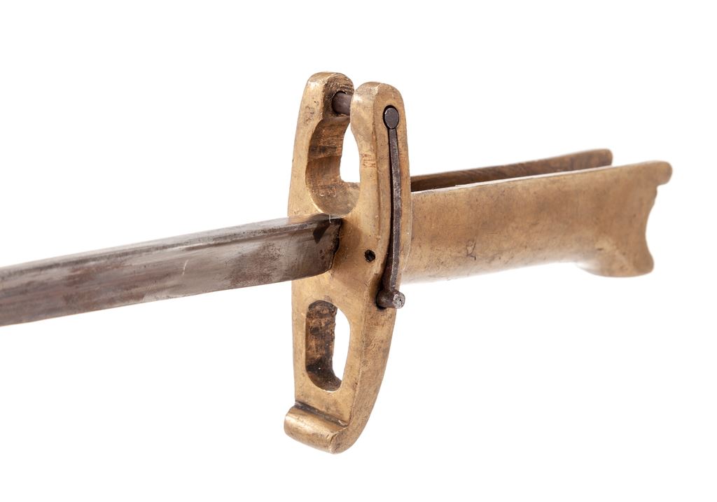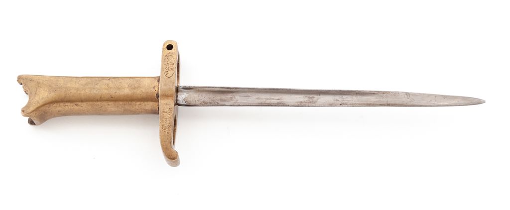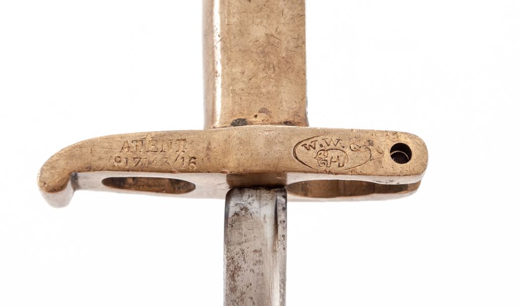 British Pritchard Webley MK VI Revolver Bayonet, 8-1/8'' blade, 12.25'' overall. Three-sided bright blade with ''rat tail'' tang that is missing securing nut. Brass handle and crossguard stamped ''(faded P)ATENT/(faded N)o17143/16'', and a circled ''W.W.G'' over elephant Greener trademark. No revolver serial number has been stamped. Steel release catch. No scabbard. Condition overall is fine with a nice even patina to the brass with minor scratches and handling marks. The fine-pointed tip of the blade is blunted with a slight flat spot that may have a minor chip, and there are stains and scratches across the surface. The catch operates smoothly. Est. :$600-$900.