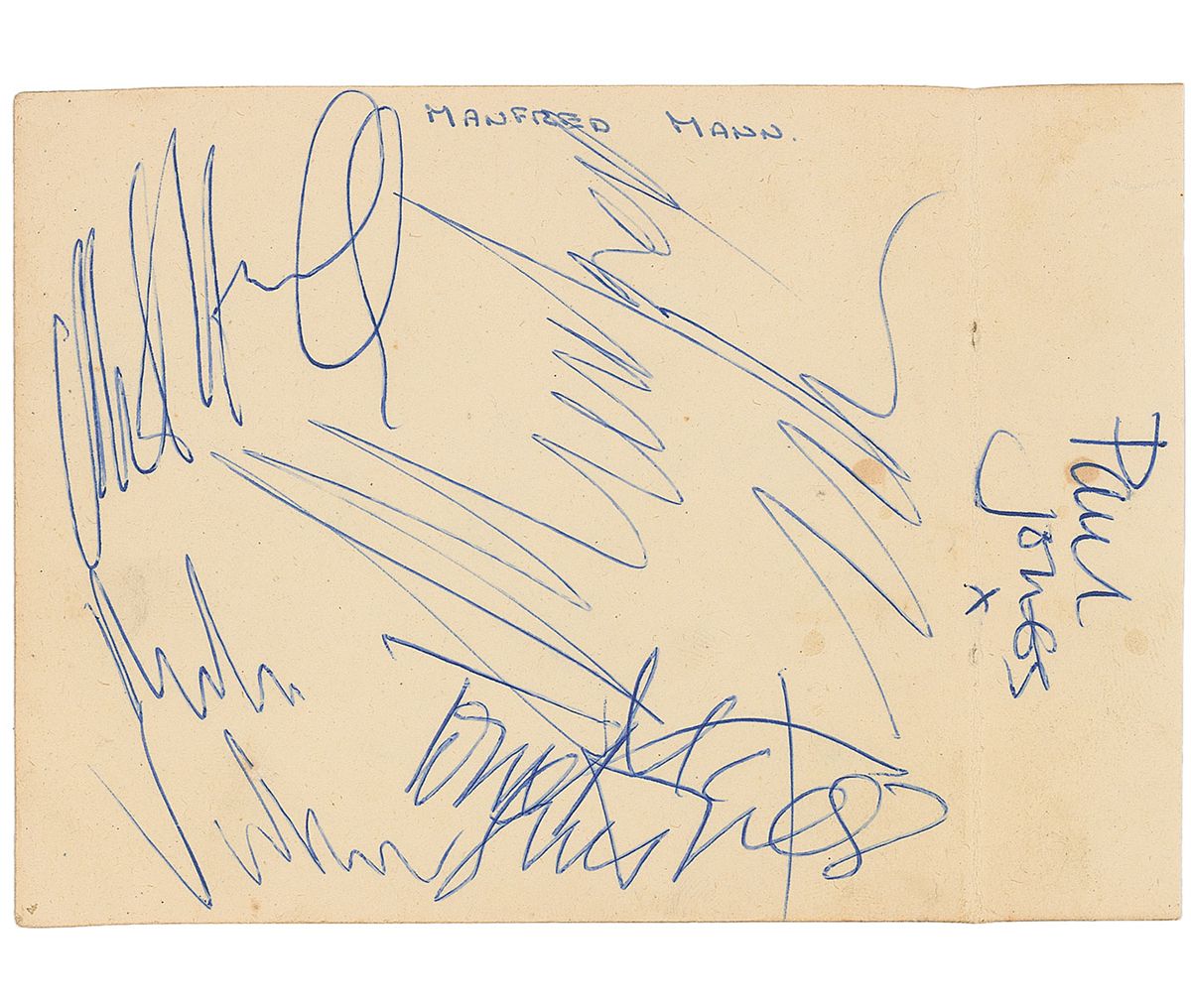 Vintage ballpoint signatures from three British rock bands, including: a 4.5 x 3 off-white slip signed by The Fortunes’ Barry Pritchard, Rod Allen, Dave Carr, Glen Dale, and one other, with Pritchard signing his first name only; a 3.5 x 4.5 trimmed promo card for The Mojos, signed on the reverse by Nicky Crouch, John Konrad, Terry O’Toole, Stuart James, and Keith Karlson; and a 5.5 x 4 off-white album page signed by Manfred Mann, Paul Jones, Mike Hugg, Mike Vickers, and Tom McGuinness, with signatures from The Rockin’ Berries on the reverse. In overall very good to fine condition, with scattered soiling, rubbing, and adhesive remnants to the Mojos card, and a few scattered stains and a vertical crease with two binding holes to the Manfred Mann page.