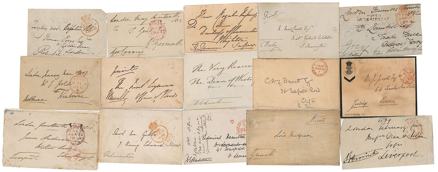 Group lot of 15 franked mailing envelopes and address panels signed by a notable member of British royalty, including: Queen Victoria (“The Queen”), Prince Albert, William Gladstone, George Canning, John Russell, Lord Palmerston, Robert Peel, William Lamb, Robert Banks Jenkinson, Edward Stanley, Charles Grey, Prince George, Duke of Cambridge, Robert Gascoyne-Cecil, and two others. In overall very good to fine condition.