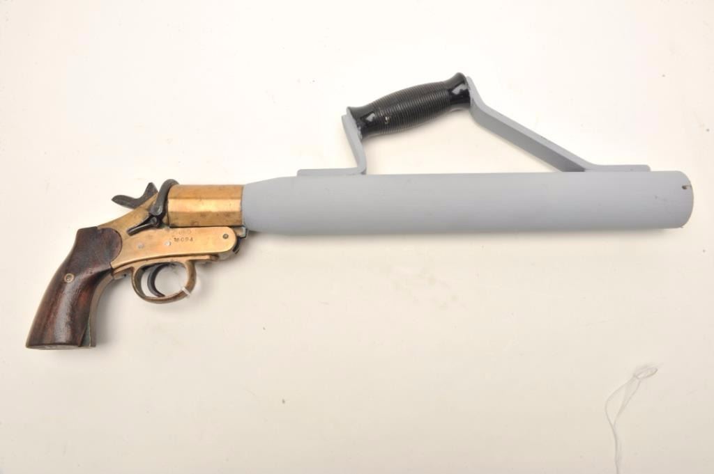 British Schermuly line throwing gun, ca. WW II, brass frame, grey painted barrel with attached handle on top of barrel, smooth wood grips, S/N 18094, approximately 20” overall; good action, grips show one chip at frontright toe. Est.: $200-$400.