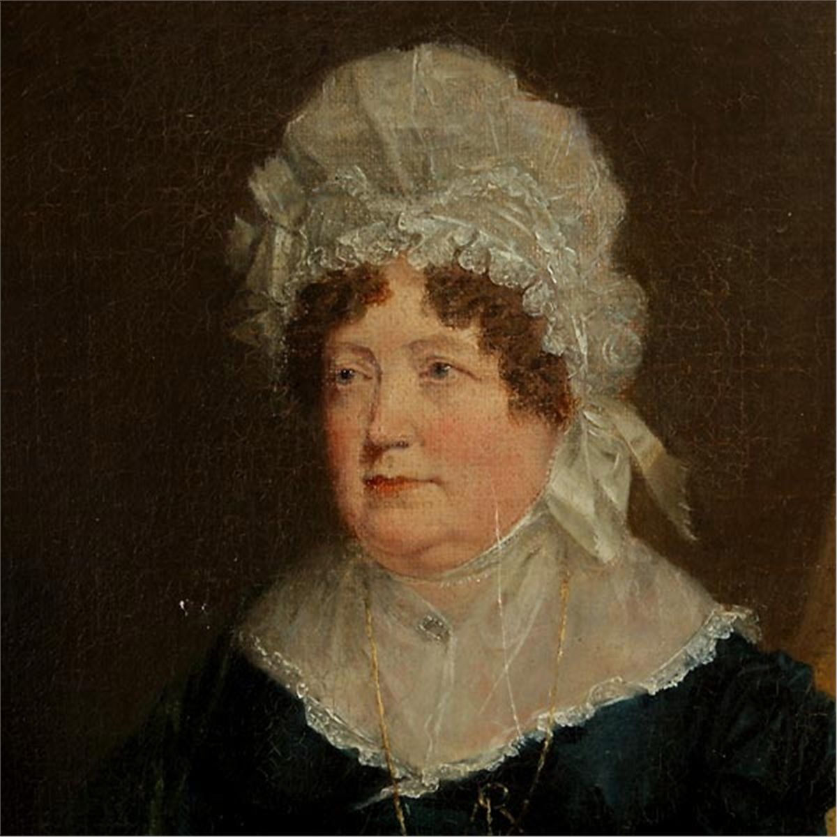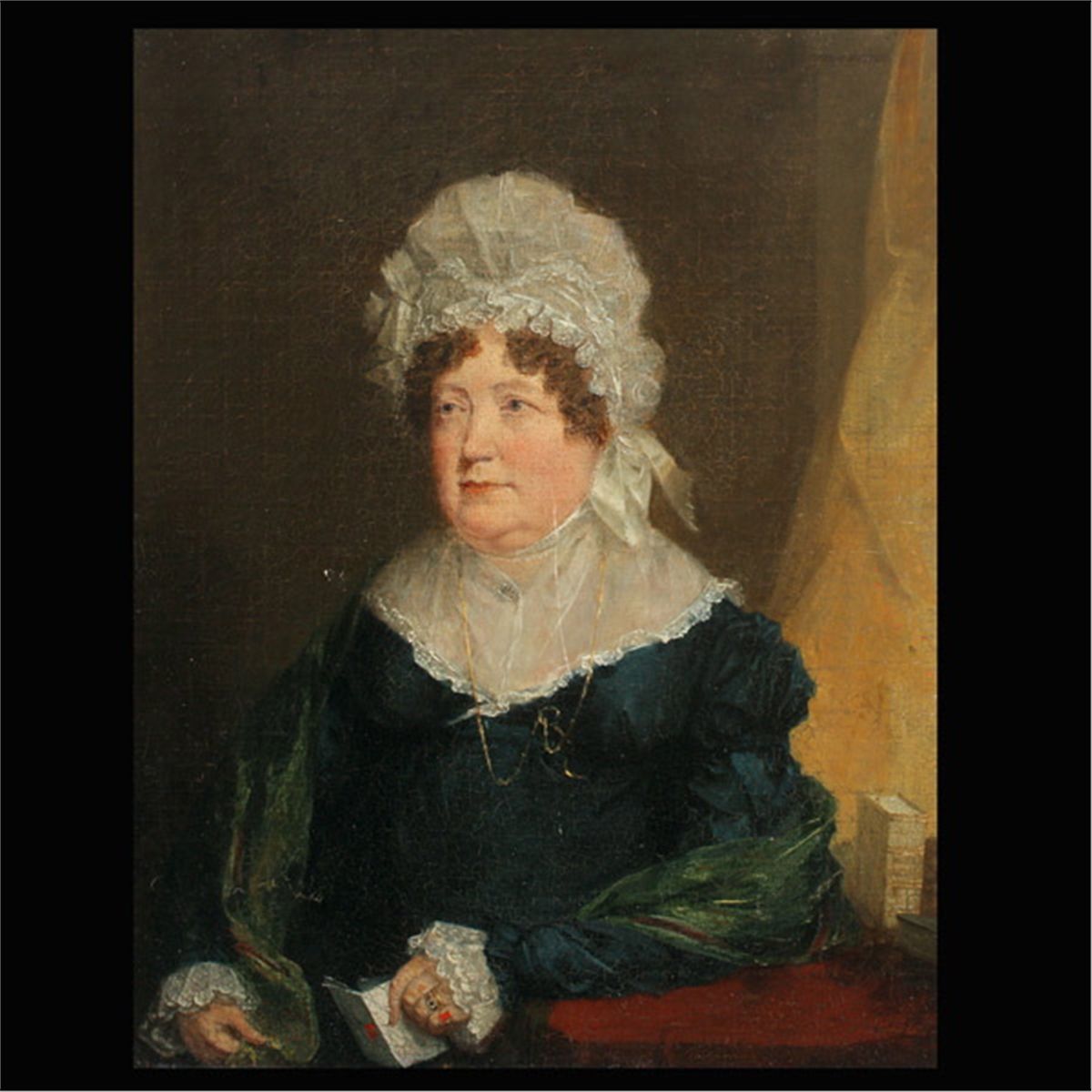 BRITISH SCHOOL (19th Century) Portrait of a Lady, 1820 Oil on canvas 10 x 8 inches/ 25.5 x 20.3 centimeters Verso: Monogramed and dated "1820" Frame: 14.50 x 12.50 inches/ 36.8 x 31.8 centimeters In good condition: Craquelure across surface, vertical scratch in center.