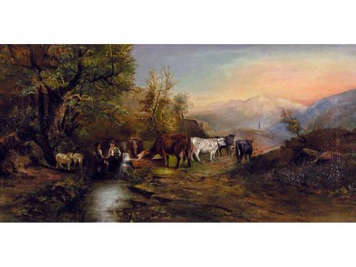 [19th century] UNTITLED; PEASANTS WITH CATTLE BY A STREAM Oil on canvas 18 x 35 ins.