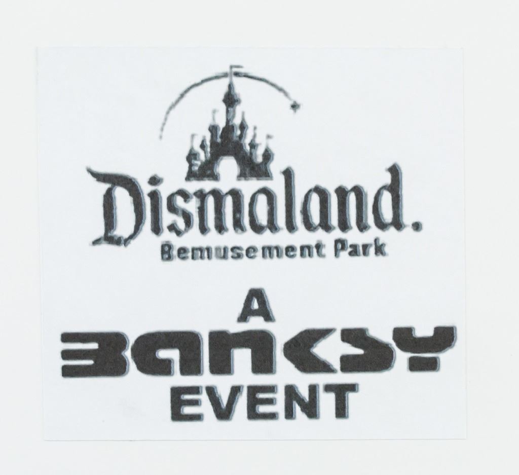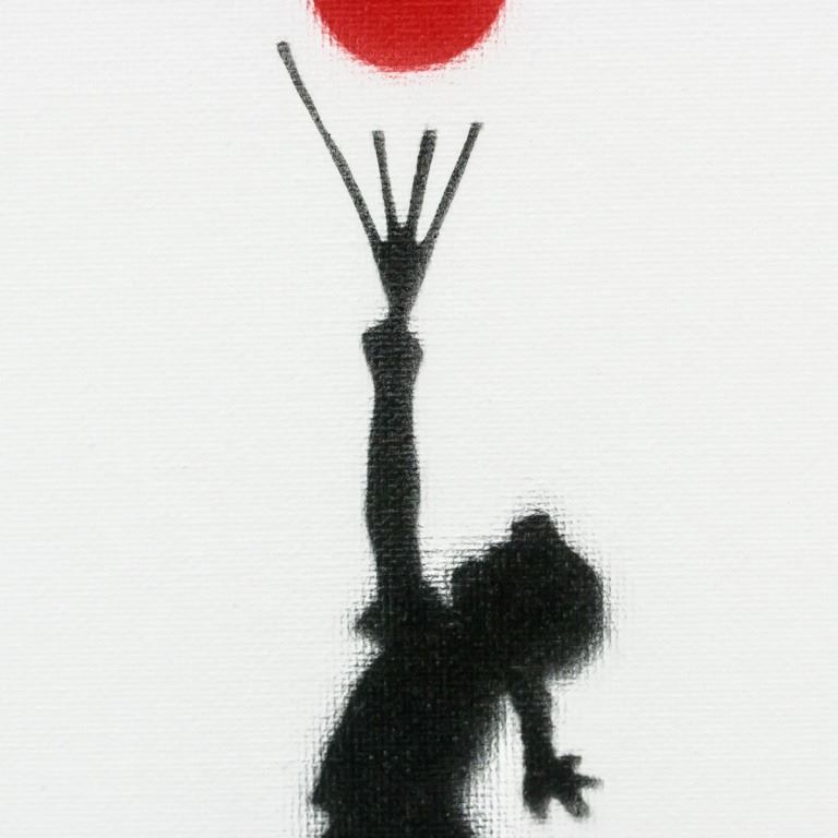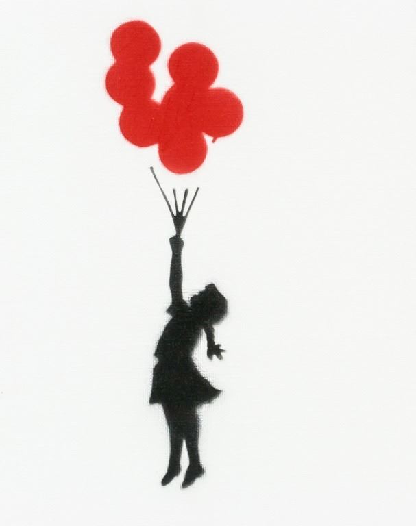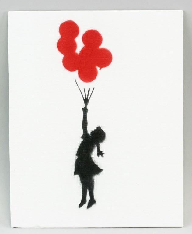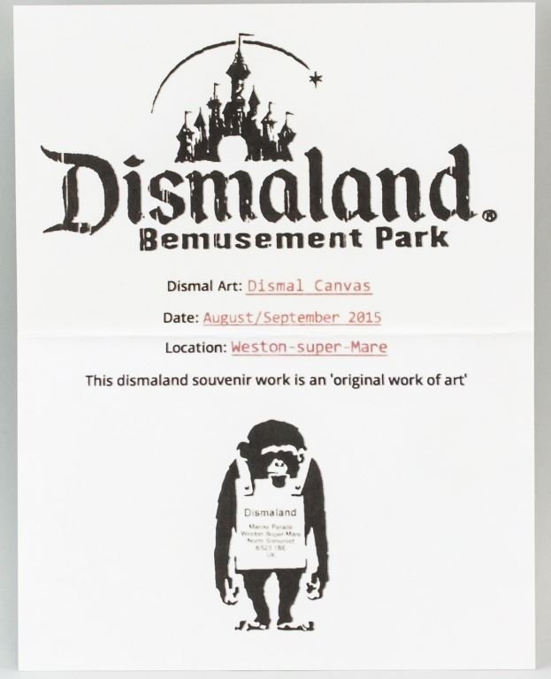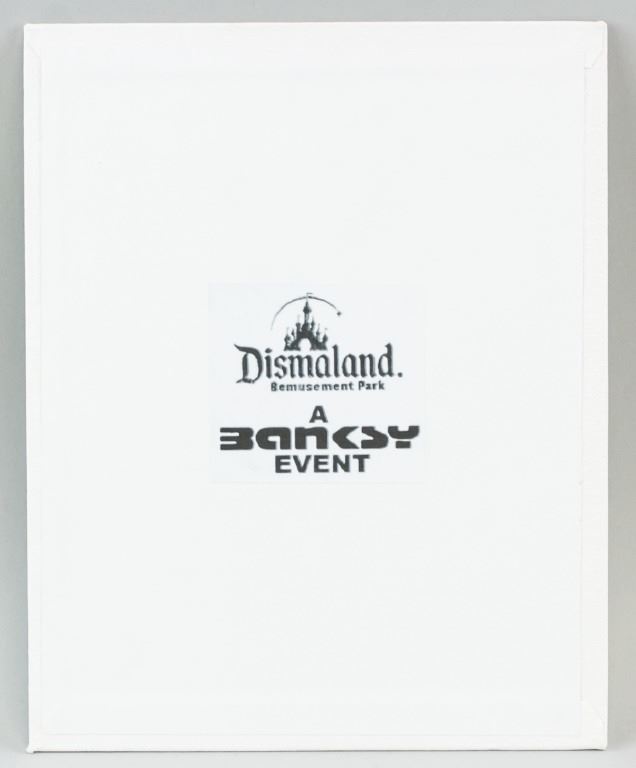 Spray paint canvas board. Featuring a girl holding up a bunch of red balloons. "Dismaland Bemusement Park A BANKSY EVENT" stamped on verso. Accompanied by Dismaland certificate. 25.5 x 20 cm (10 x 8 inches).