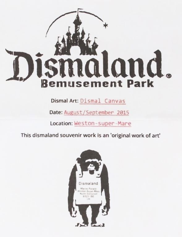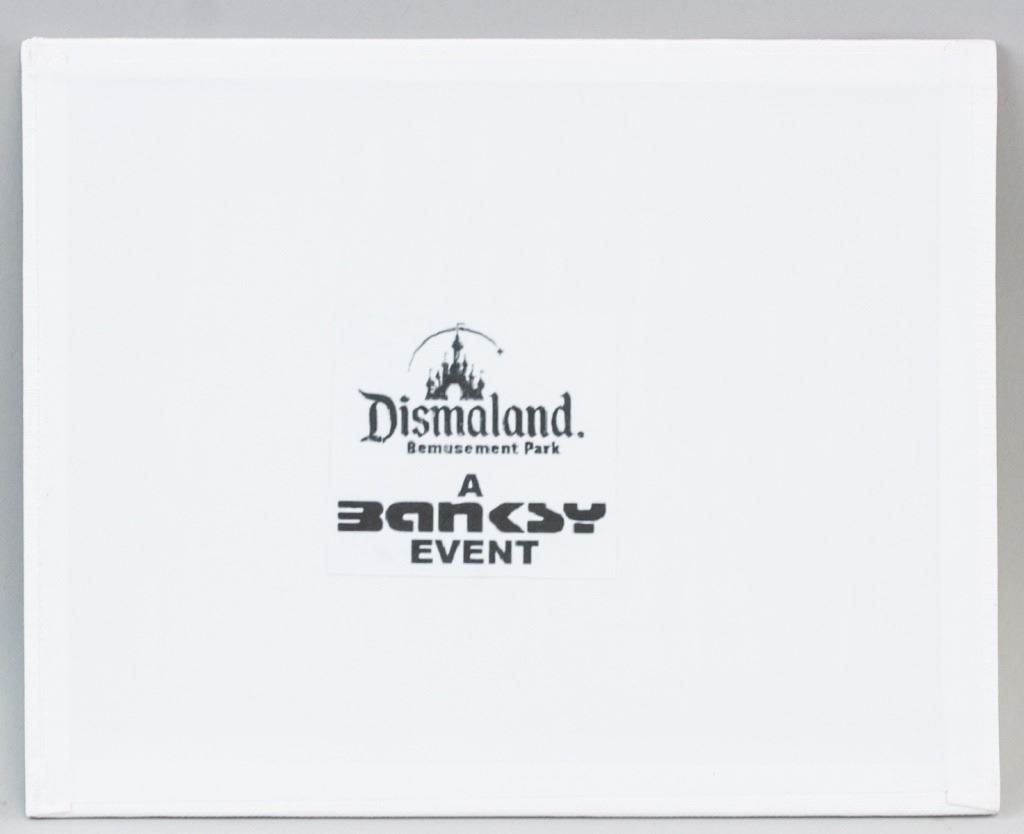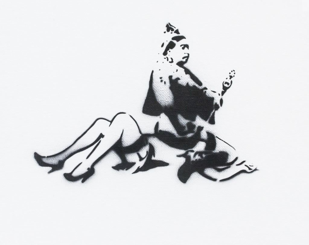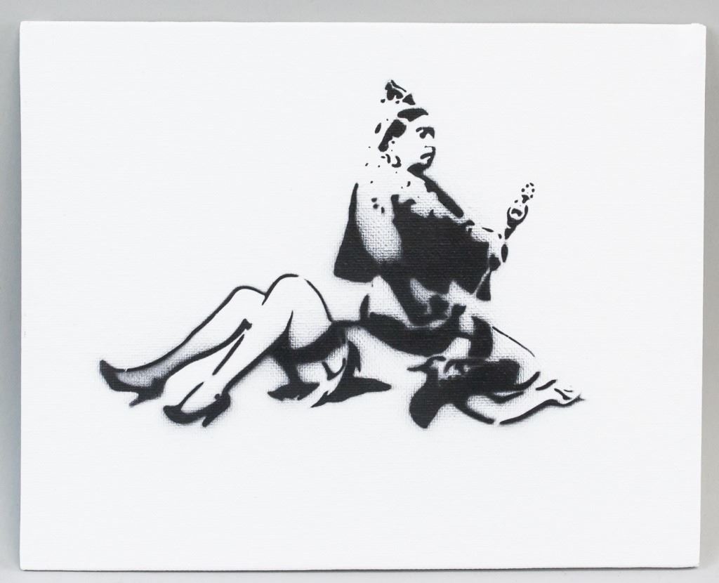 Spray paint on canvas. Featuring the queen sitting on top of a woman. Stamped "Dismaland Bemusement Park / A Banksy Event" on verso. Accompanied with Dismaland Bemusement Park certificate. 20.5 x 25.5 cm (8 x 10 in).