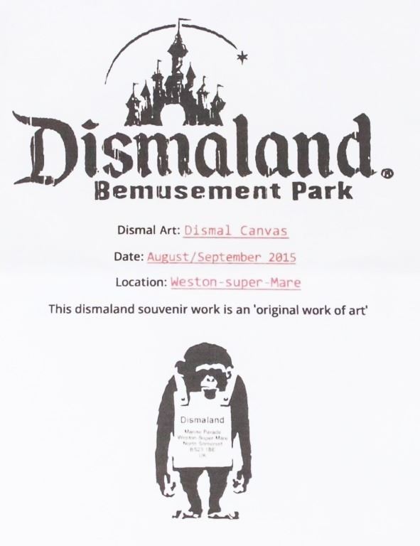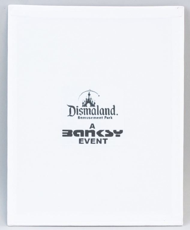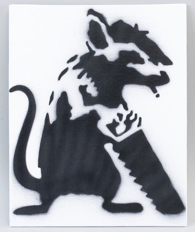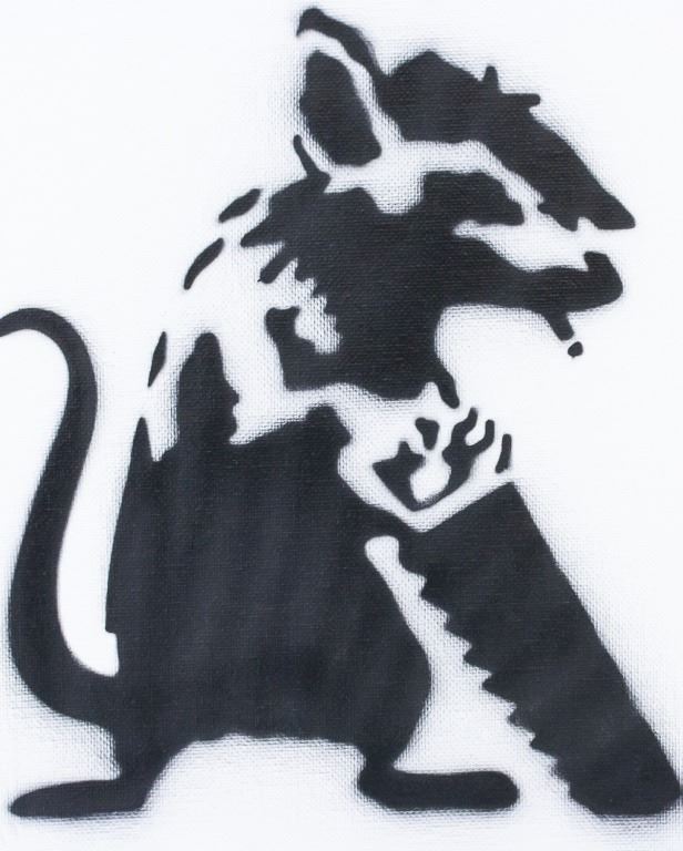 Spray paint on canvas. Featuring a rat holding a hand saw. Stamped "Dismaland Bemusement Park / A Banksy Event" on verso. Accompanied with Dismaland Bemusement Park certificate. 25.5 x 20.5 cm (10 x 8 in).