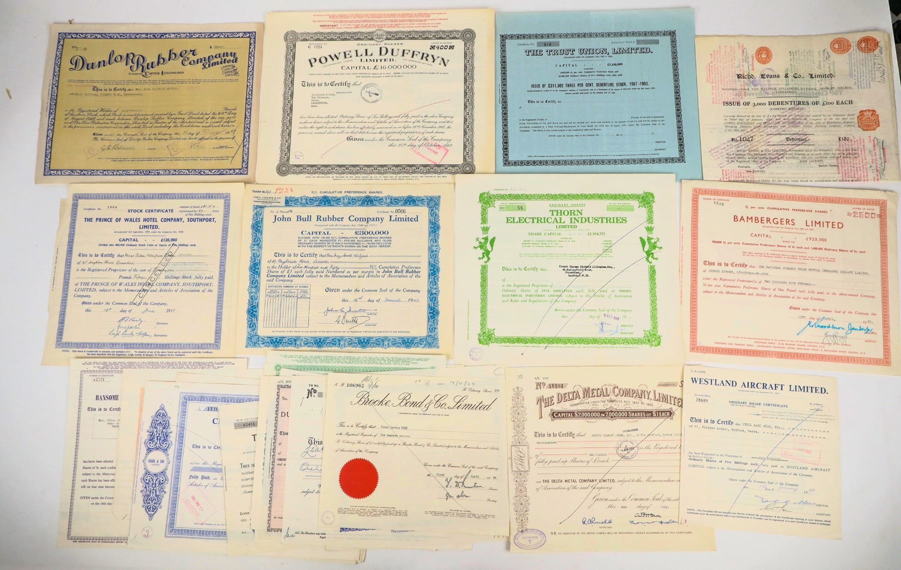 Group of 28 British stocks: Richd. Evans & Co.(1899); Westland Aircraft Limited (1960); The Delta Metal Company (1955); Brooke, Bond & Co. (1964); A. B. Metal Products (1983); Mercantile Investment Trust (1961); Dunlop Rubber Co. (1959); Turner & Newall (1960); Slough Estates (1967); National Provincial Bank (1961); Telephone Rentals (1961); Trust Houses (1964); Chubb & Son (1965); J. Gliksten & Son (1963); Industrial & General Trust (1958); Westminster Bank (1964); Metal Box Company (1960); Law Debenture (1967); Ready Mixed Concrete (1963); Ransome & Marles Bearing Company (1960); Bambergers (1962); Thorn Electrical Industries (1959); John Bull Rubber Company (1948); The Trust Union (unissued); Powell Duffryn (1963);The Prince of Wales Hotel Company (1955); Dunlop Rubber Company (1947).