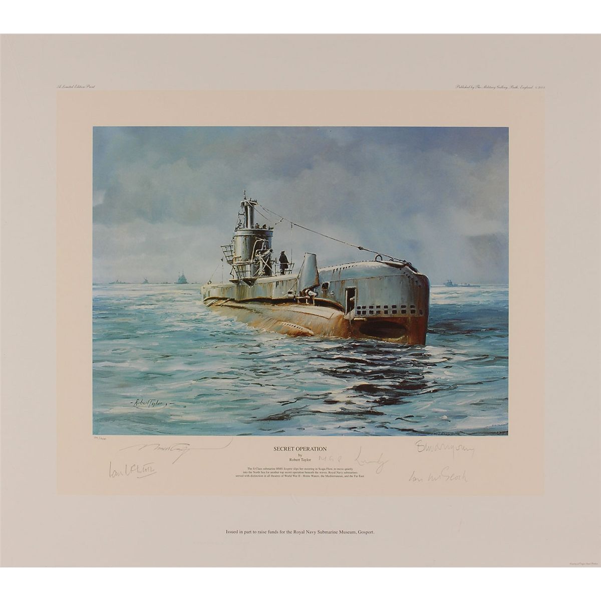 Color limited edition 19.5 x 17.5 print entitled ‘Secret Operation,’ numbered 59/700, signed in pencil by Vice Admiral Michael Lumby, Commander Edward Young, Vice Admiral Ian McGeoch, and Vice Admiral Ian McIntosh. Also signed in pencil by the artist, Robert Taylor. In fine condition.