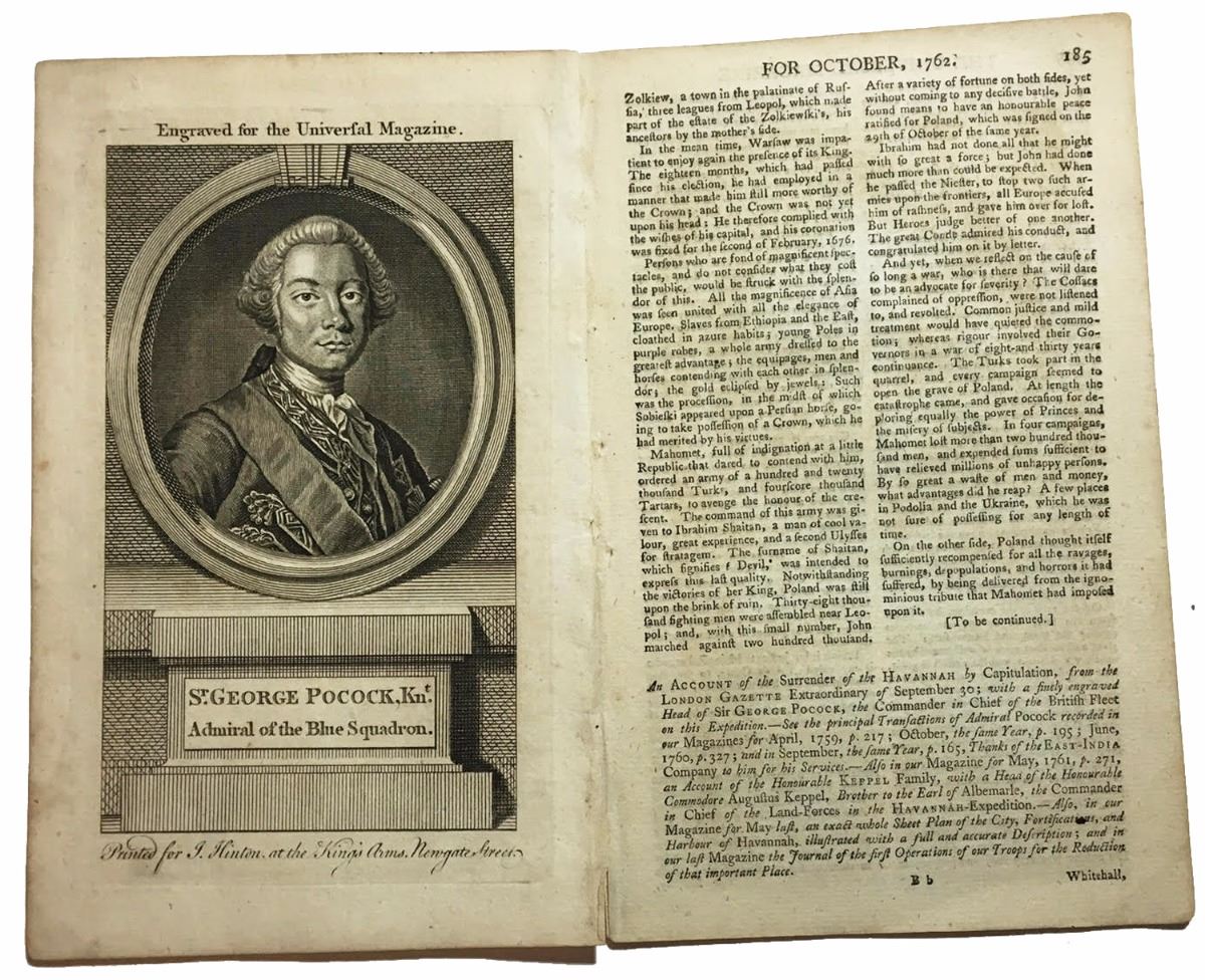 British Universal Magazine article from the October 1762 issue entitled "An Account of the Surrender of the Havannah [Cuba] by Capitulation" with engraving of Admiral George Pocock. 10" x 8" (image size 6-1/4" x 3-5/8"). Fourteen-page article with engraved plate of Pocock in front, excellent condition (minor foxing only). The battle described within was a 6-month engagement during the Seven Years' War in which the British besieged and captured the city of Havana (returned to the Spanish in the 1763 Treaty of Paris), which dealt a serious blow to the Spanish at the time.