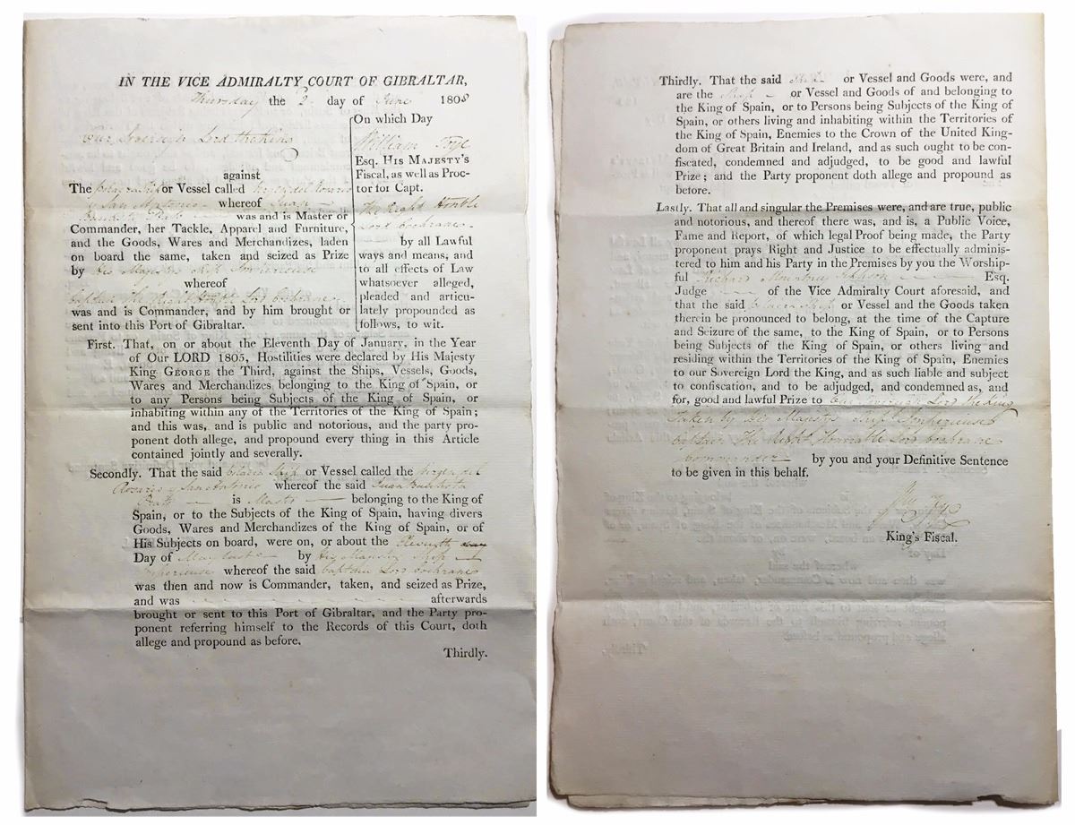 British Vice Admiralty Court of Gibraltar document dated June 1808 regarding the capture of the Virgen del Rosario y San Antonio by Admiral Cochrane, asking the court to judge it a lawful prize. 13" x 8-1/4". One large sheet of paper printed on two sides of one half plus the outside quarter panel of the other half (originally folded into quarters), the printed sections interspersed with light handwriting, accompanied by a typed summary and background, the document in excellent condition albeit with all the original folds. Admiral Cochrane was one of England's greatest sailors but often found himself in disagreement with the Navy. Eventually he became Commander in Chief of the navies of Chile and Brazil and was an important figure in those countries' bids for independence (as well as Peru).