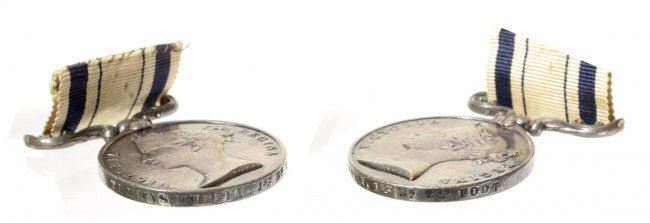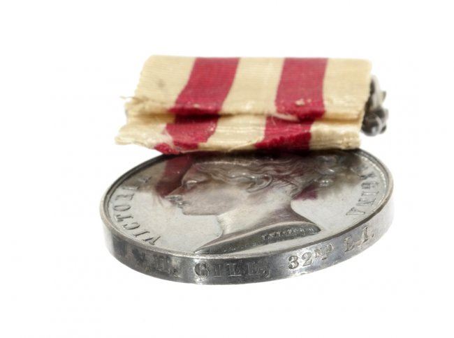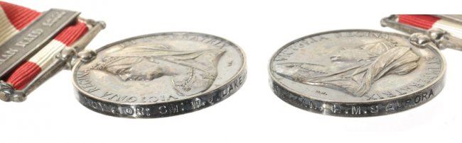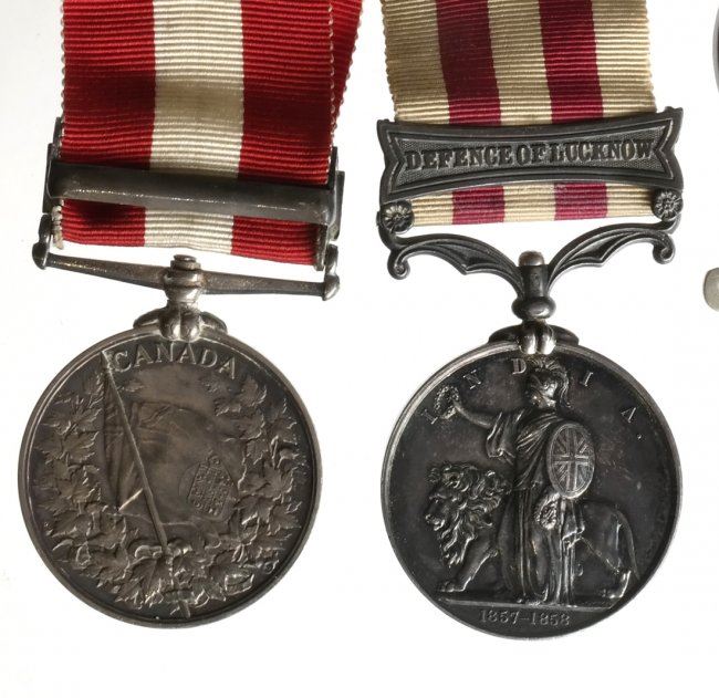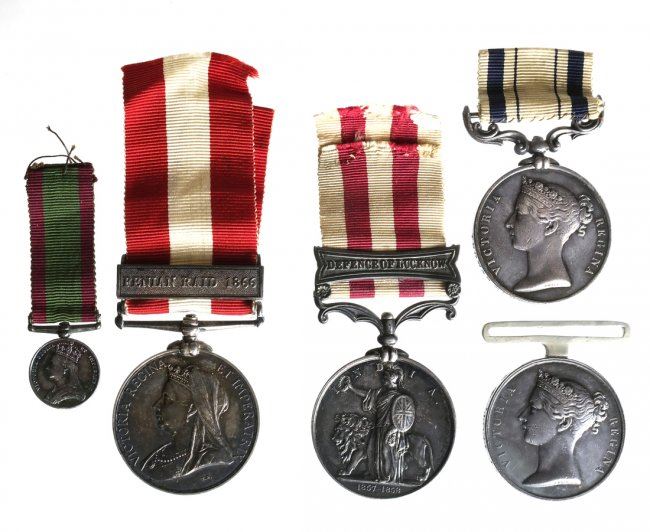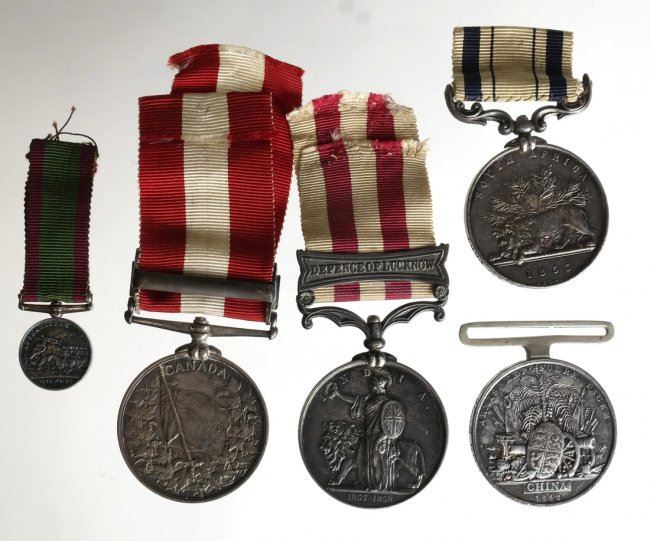 Five Victoria silver campaign medals from various series. Four with ribbons and four named. The first 1842 China, no ribbon soldered suspender. Fine. Cleaned and scuffed. The second, 1865 Queen's South Africa. No bars with swivel. Fine. edge bumps. The third, 1857-1858 Indian with bar "DEFENCE OF LACKNOW." Very fine. Old tone some hair lines. the fourth, Canada "FENIAN RAID 1866." Very Fine. Obverse hairlines. The fifth, Afghanistan silver miniature on swivel with ribbon. Choice EF. Iridescent toning. The first three are ex. Garrett Collection, Bank Leu Sale.