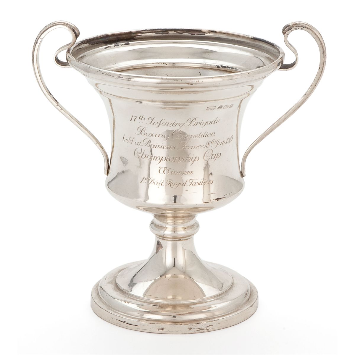 Stunning WWI artifact, this engraved British Boxing Trophy is from the personal collection of Malcolm S. Forbes. Presented in France in 1919 by the British Expeditionary Force to the First Battalion Royal Fusiliers as winners of the 17th Infantry Brigade Boxing Competition held at Baisieux, France. Polished and engraved with an inscription commemorating the win, the trophy is also engraved with the date 18 January 1919, just eleven months before the Armistice that ended The Great War. 9.5'' tall. Fine.