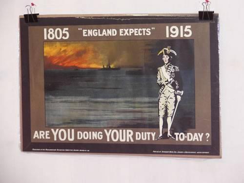 British WWI Poster, "1805 "England Expects" 1915 – Are You Doing Your Duty Today?", Artist-Not Provided, Printer-Parliamentary Recruiting Committee/Seargeant Bros. Ltd.-London and Abergavenny, 19 1/2' x 29", Condition – Very Good: 3 Small Border Tears,