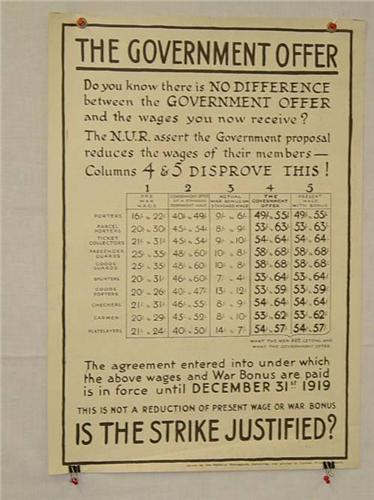 British WWI Poster, "The Government Offer etc. Is the Strike Justified?", Artist-Not Provided, Printer-National Propaganda Committee/Carlton Printers-London, 28 1/2" x 20", Condition – Good: Lower Border Crease, Minor Right Side Border Staining, 4" Stabilized Tear (in Chart); Linen Backed w/ Grommets,
