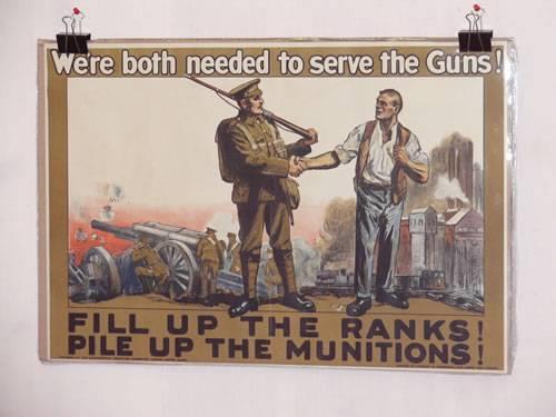 British WWI Poster, "We're Both Needed to Serve the Guns! Fill Up the Ranks! Pile Up the Munitions!", Artist-Not Provided, Printer-Parliamentary Recruiting Committee/Chorley and Pickersgill Ltd.-Leeds and London, 20 1/4" x 29 1/2", Condition – Very Good: Corner and Folding Creases,