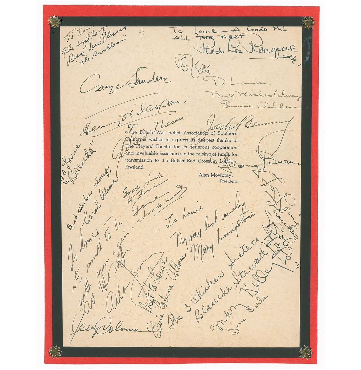 Vintage program page from a British War Relief Association of Southern California event, 8.25 x 11.5, signed in fountain pen by 19 attendees, including: George Sanders, Gertrude Niesen, George Burns, Gracie Allen, Jack Benny, Bob Hope, Henry Wilcoxon, Blanche Stewart, Jerry Colonna, Gene Lockhart, and Elvia ‘Cobina’ Allman. Page is affixed to a slightly larger sheet of red cardstock, with Dymo labels affixed to edges of page. In fine condition.