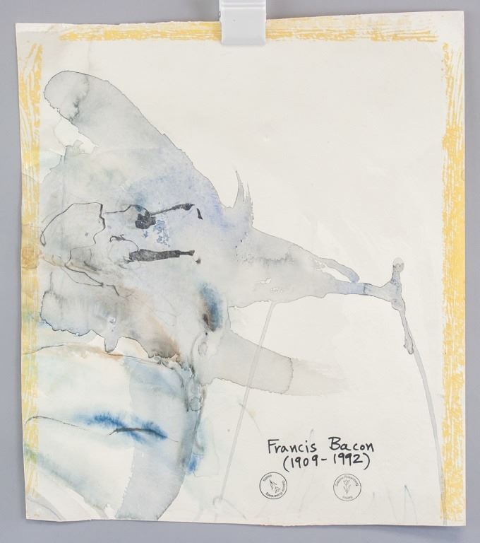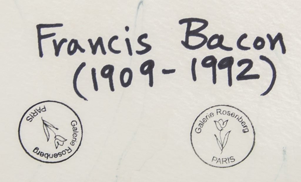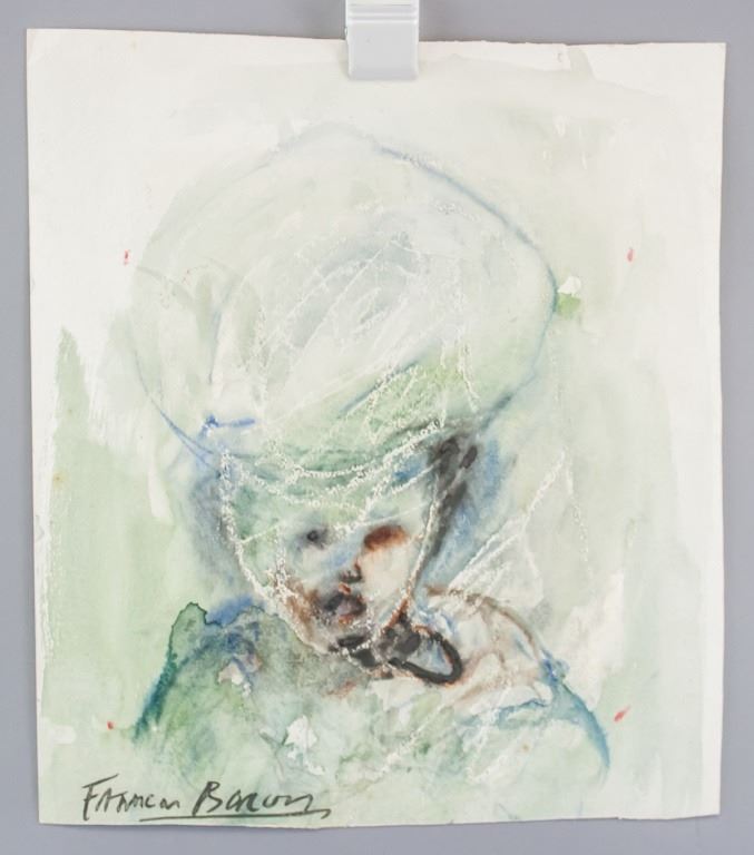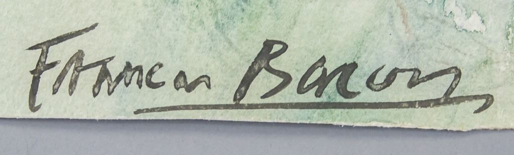 Watercolor on paper. Featuring portrait. Signed "Francis Bacon" to the bottom left corner. "Francis Bacon (1909-1992)" inscribed on verso. Stamps on verso reads "Galerie Rosenberg PARIS". 40 x 36 cm (15.7 x 14.3 inches).