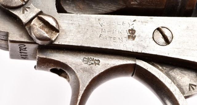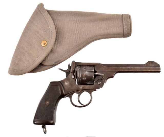 * Blued finish, 6" barrel, .455 caliber. Replacement lanyard ring. Grip has Squadron No "161", "RAF" stamped on left side of frame. c.1918