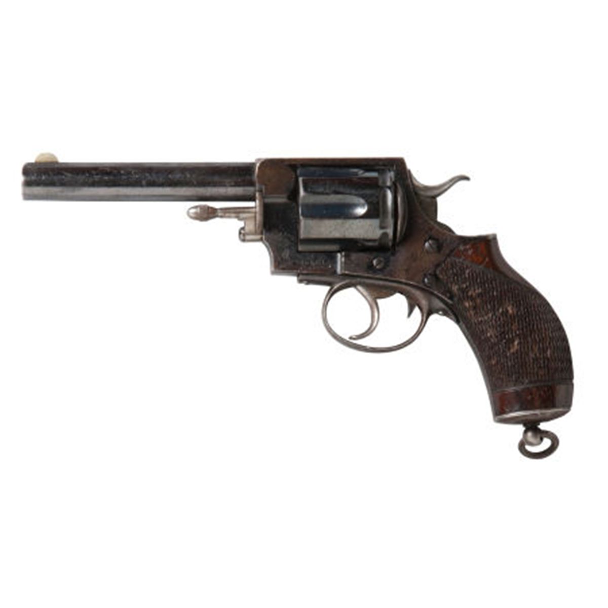 British Webley No. 5 360 CF Double Action Revolver. Serial no. 86661, .38 caliber, 4 ½-inch barrel with German silver sight. Topstrap marked: L. & G. Higham,/Liverpool. Blued finish. Fluted cylinder. Double action. Checkered walnut one-piece grip. Lanyard ring.Condition: Very good. Retaining approximately 60-65% finish mixed with grey-brown age patina. Grips with light wear, bruises and flaking finish. Action fine.