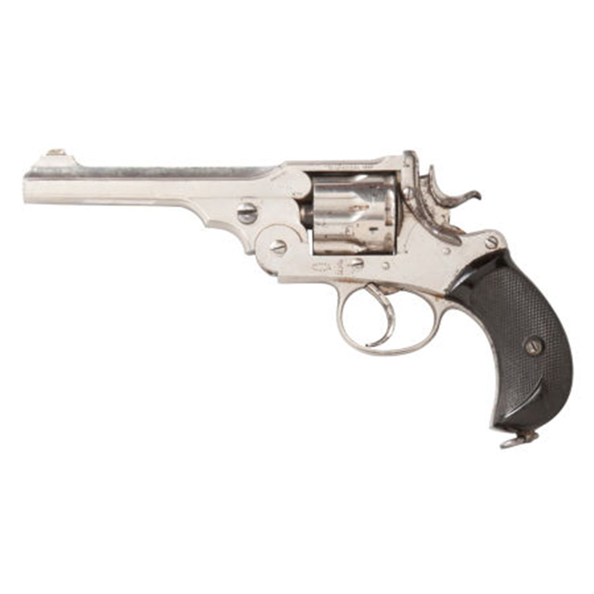 British Webley "WG" Army Second Model 1889 Double Action Revolver, Watson Brothers Retailer. Serial no. 3209, .455/476 caliber, 6-inch barrel with standard sight. Nickel-plated finish. Cathedral style fluted cylinder. British proofs. Black checkered Bakelite grips. Lanyard ring.Condition: Excellent. Retaining approximately 85-90% finish with scattered light wear and fine scratches. Barrel latch with minor pitting. Grips with light wear and marks, right grip faded. Action crisp.