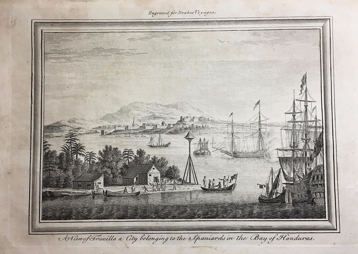 British copperplate engraving (ca. 1768) entitled "A View of Truxillo a City belonging to the Spaniards in the Bay of Honduras," from a series with "Engraved for Drakes Voyages" at top. 13-1/2" x 9" (image size 9-1/4" x 6-1/2"). A fairly serene harbor scene, highly detailed, with ships unloading onto a palmy beach in the foreground, city and mountains in background, the intensity of the ink decreasing with distance for a 3D feel, nice condition except for foxing and minor chips and bending in edges.