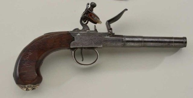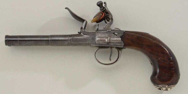 British double barrel Flintlock pistol with silver mask butt and cannon barrels signed “Henshaw, Cambridge”. The pistol measures 11” overall with 5” screw type barrels of approx 46 cal smooth bore. The pistol showsa center mounted single hammer with finger lever on left side of action which blocks or opens left barrel for firing either one or two shots at a time. The metal surfaces are in very good condition showing crispengraving and just normal aging. The stock is very good plus with a few dings, mars etc. The mask butt shows British hallmarks. Henshaw made high quality arms and was known for his Blunderbusses and multi-shots in themid 18th century. Est.;$2,750-$5,500.