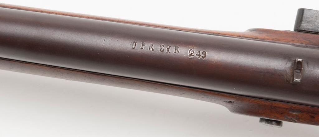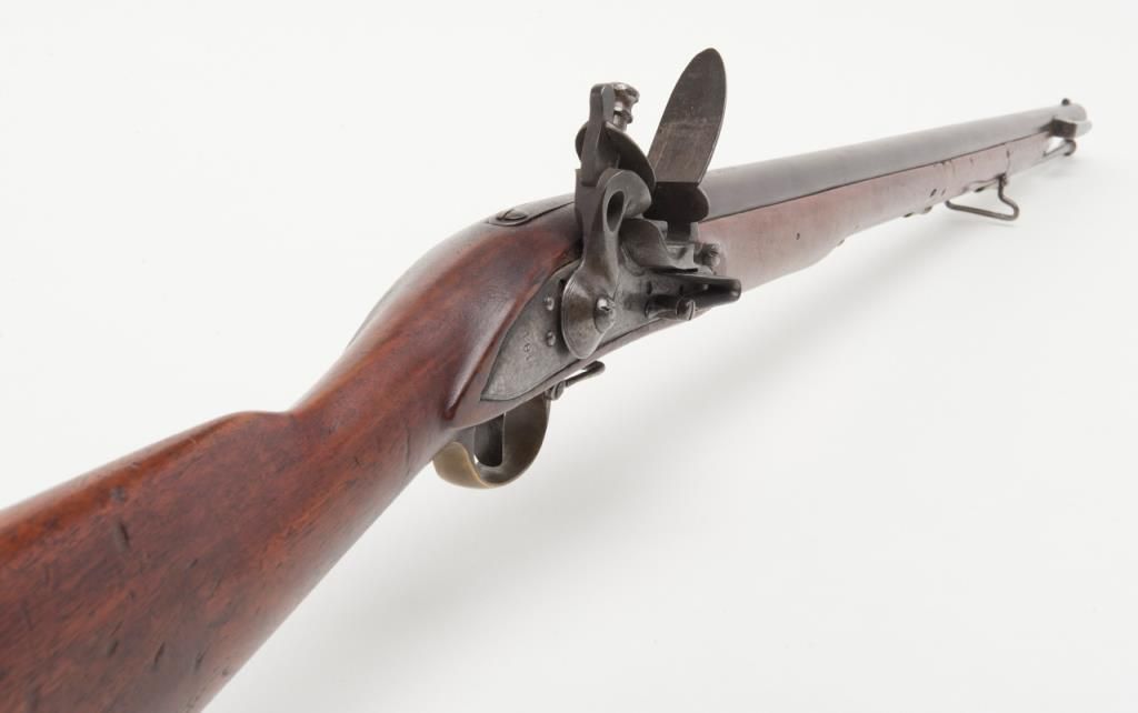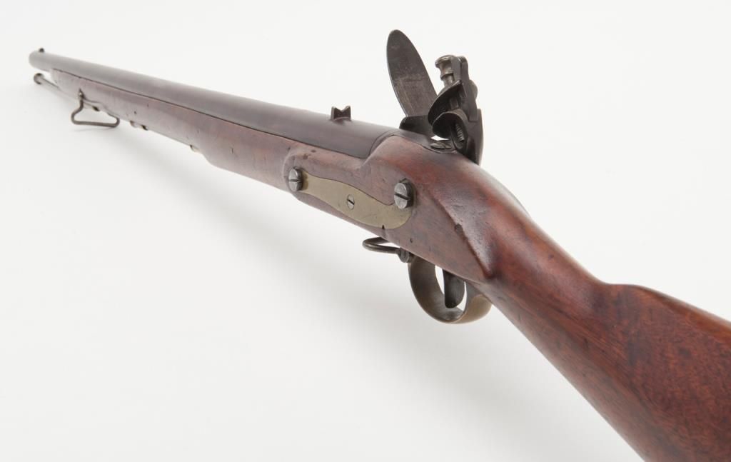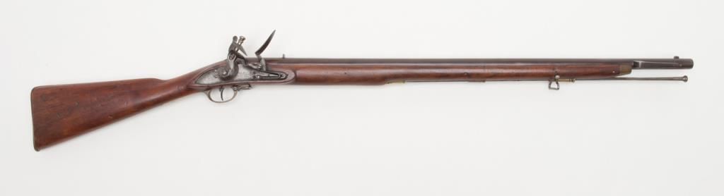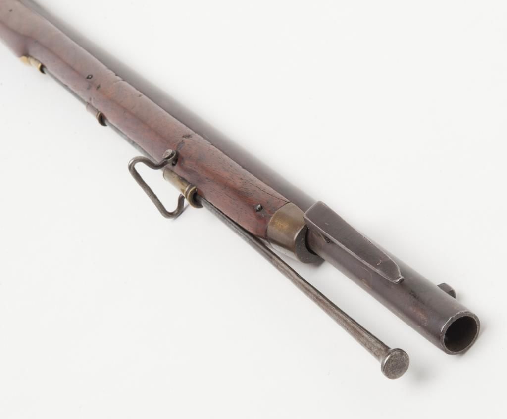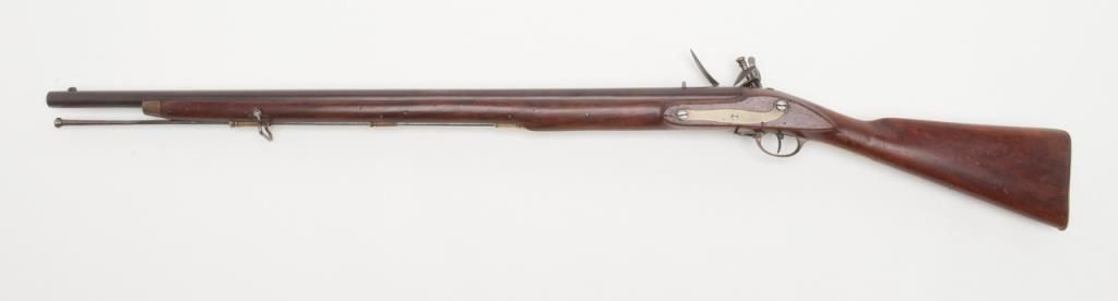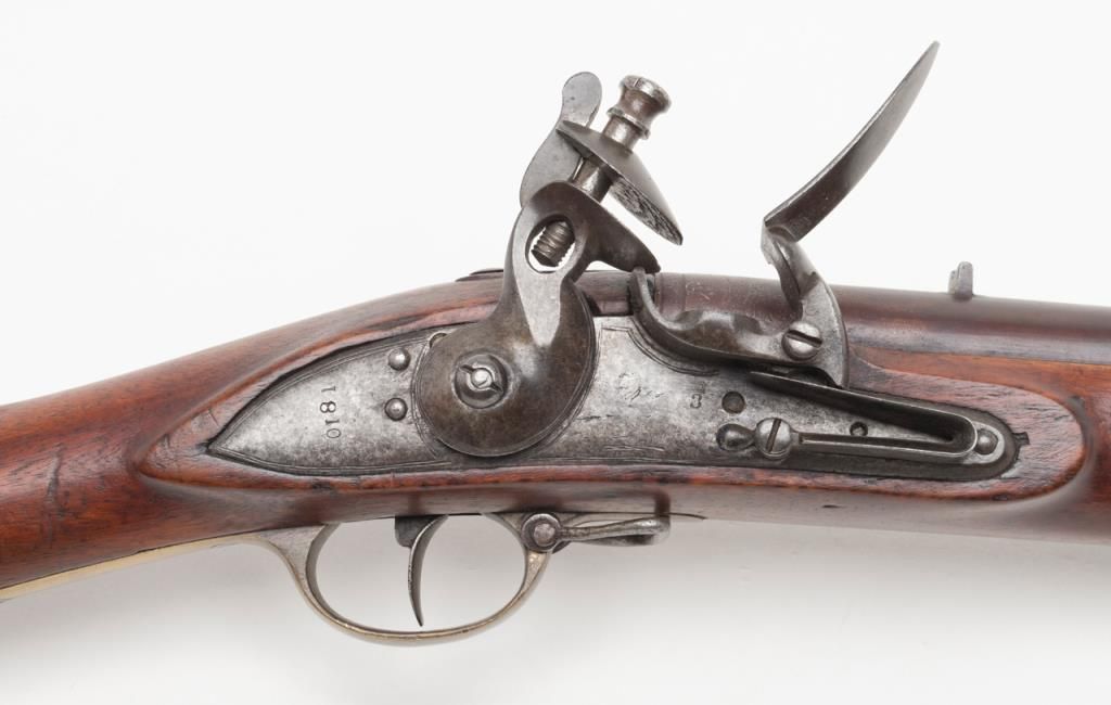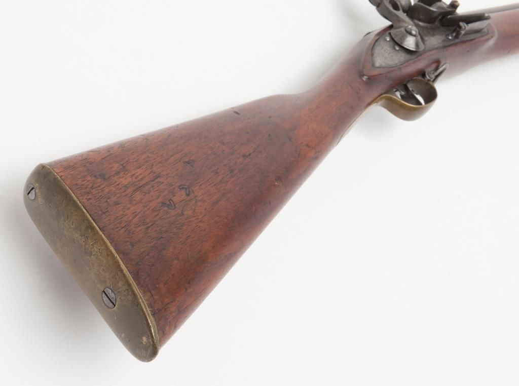 British late pattern flintlock musket with mount for saber bayonet showing standing Lion on the lock and 1810 date probably made for East India Company in very good plus original condition. The barrel is stamped in block letters “JPR, EXR,249”. The barrel measures 33 ¾” and approximately 69 caliber smoothbore. Showing typical English style brass mounts with sling swivels and side plate secured by two large and one small screw. There is a V notch rear sight originally mountedon the rear of the barrel which matches a post front sight. The barrel retains most of its original brown finish with some minor pitting. The lock shows traces of original case hardening going to gray with all original small parts. Thestock shows just some minor aging and is at least very good plus with slight imperfections. Est.: $800-$1600
