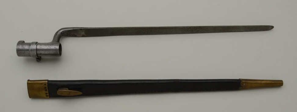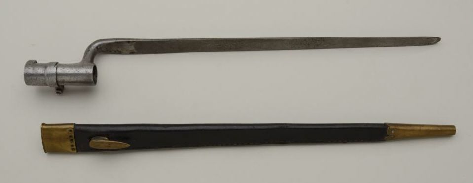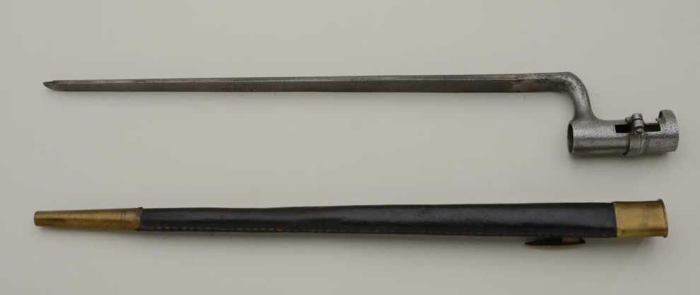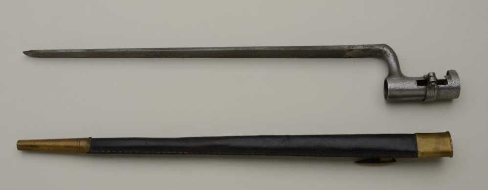 British musket socket bayonet with brass mounted leather scabbard; bayonet is in fair condition showing a cleaned surface and scattered pitting; scabbard is good with broad arrow and WD proof. Est.: $75-$150.
