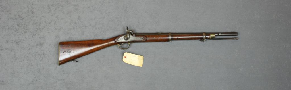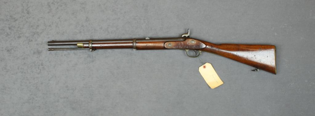British proofed and cartouched Tower  percussion carbine, .58 cal., 24” round  barrel with integral bayonet lug and iron  ramrod, brass butt plate, trigger guard and  front stock cap, wood stock, #NVSN.  This gun is in overall very good condition showing an  even plum brown patina on barrel, slight  hints of case color on the lock plate and  hammer, clear markings, very good to fine  bore, crisp action, very good stock with some scattered dings and mars from carry and  storage; inspector’s wheel cartouche on right  butt stock with double broad arrow proofs.   Est.:  $900-$1,800.