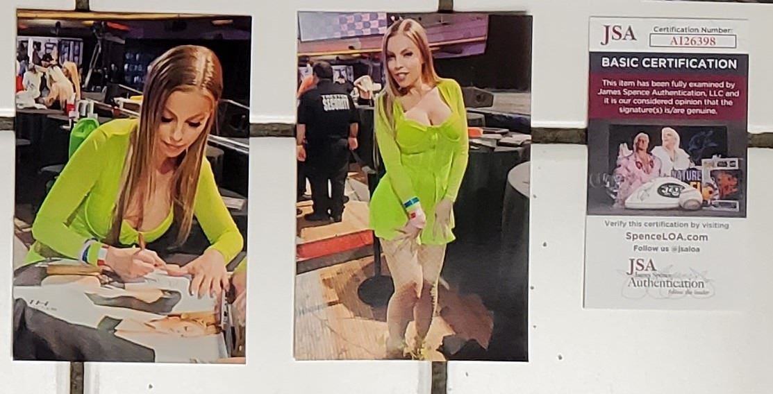 I personally obtained Britney Amber’s autograph. A photo of her signing the piece is included. JSA also authenticated the autograph.