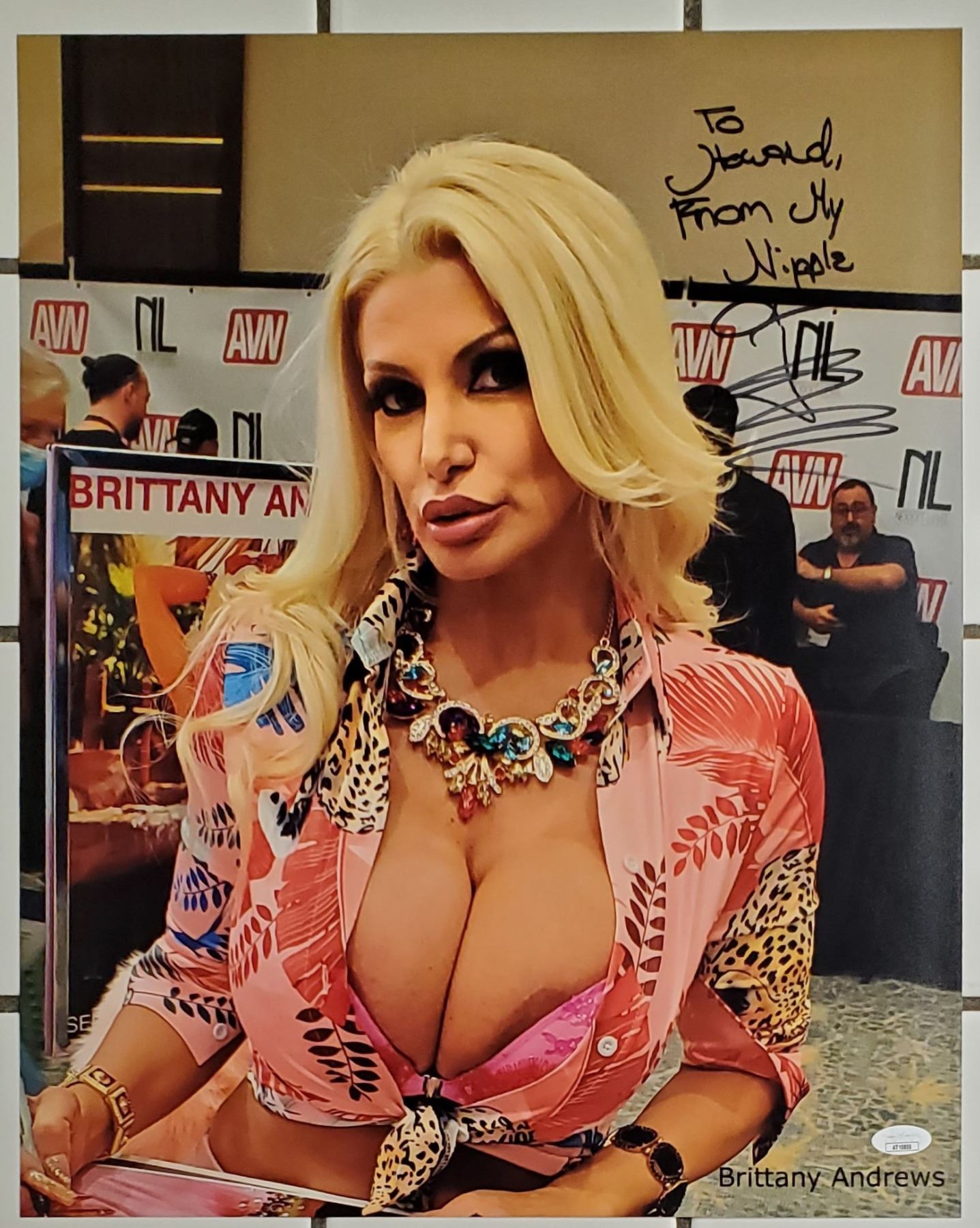 I personally obtained Brittany Andrews’ autograph. A photo of her signing the piece is included. JSA also authenticated the autograph.