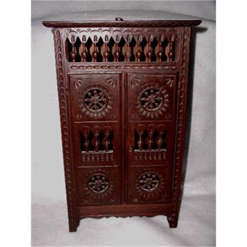 Adorable small wooden Brittany French cabinet is hand made C.1860-65. Same carved floral and spindle design as on the huge cabinets can be seen on the top,sides and front double doors with tiny knob. Openwork worked into all front designs. Every section of wood offers some motif,under the top panel,along the sides of the doors,etc. A metal hook and latch on the interior of the left door. Two large storage areas on the interior 7.5H X 8.5L X 4.5D (top) 5D (bottom). Overall measurement 18H X 11L X 5.75D. Excellent condition as was hung all these years with the brass top hanger,giving stability and no stress to the legs. Perfect for a spice cabinet,desk accessories,bath toiletries,miniature collections,etc.Scalloped lower apron and legs.