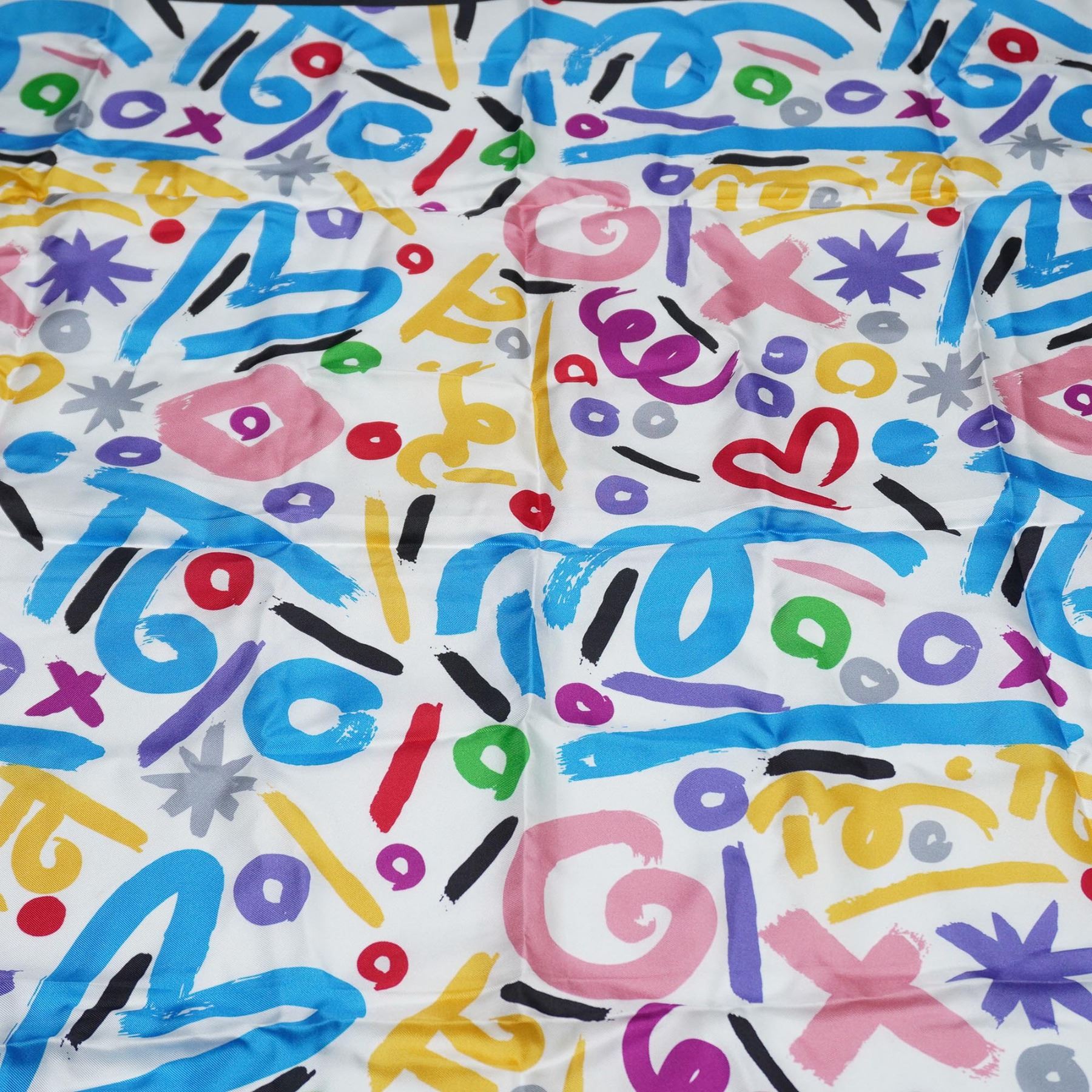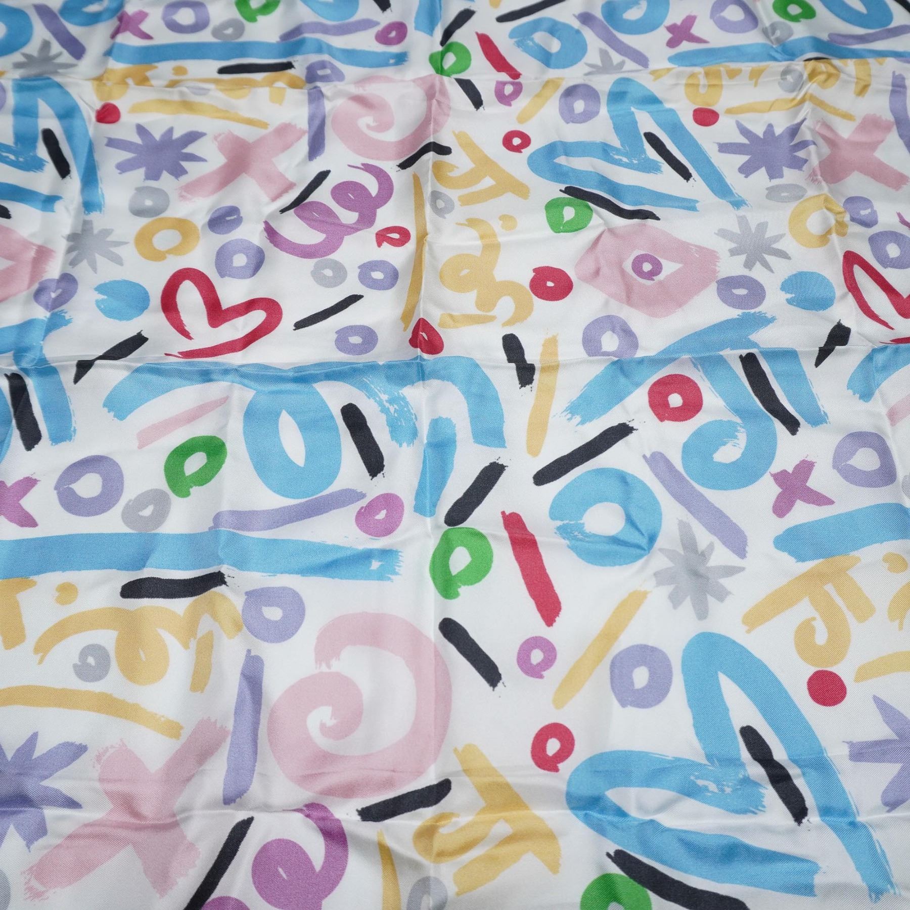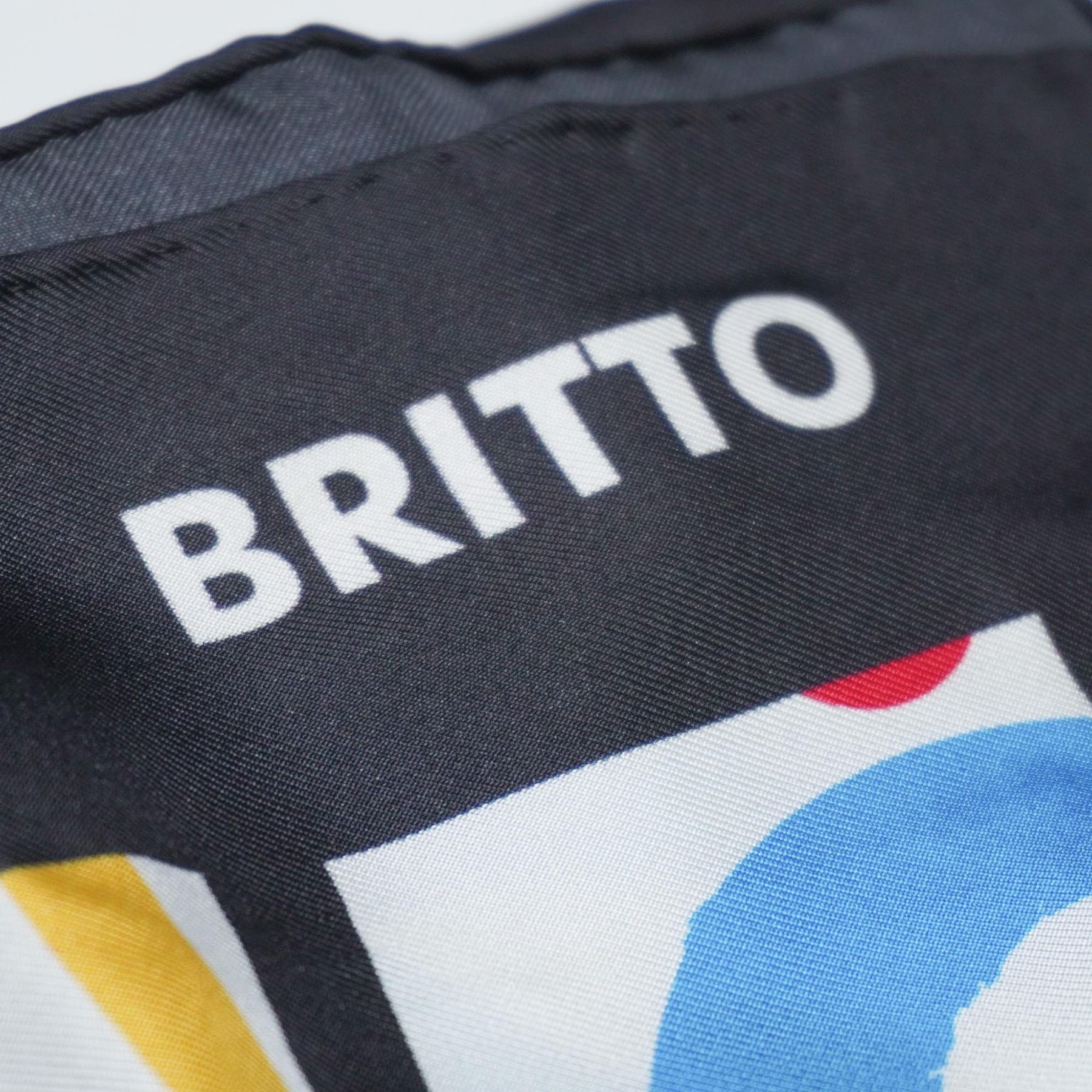 100 percent silk scarf featuring a vibrant, abstract print in multicolored brushstroke style motifs by renowned Brazilian artist Romero Britto. The design is signed Britto 76 on one edge and includes the artist's name prominently printed along the black border. This scarf showcases Britto's signature pop art aesthetic, combining bold patterns with optimistic energy. A dynamic and collectible accessory for art lovers and fashion enthusiasts alike.