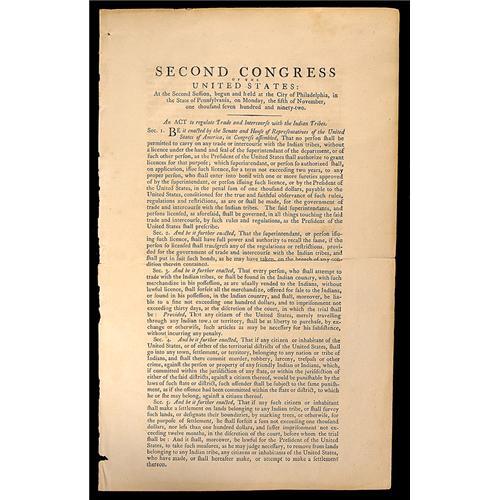 <Our item number 140692><B>[Washington, George] Broadside From 2nd Congress Re Indian Tribes.</B> Immaculate printed broadside from the Second Congress of the United States regarding an "Act to regulate Trade and Intercourse with the Indian Tribes," signed in print by George Washington, 3pp (recto/verso/recto on conjoined pages), 12½ x 7½ in., 5 November 1792. In part: "… no person shall be permitted to carry on trade or intercourse with the Indian tribes… as the President of the United States shall authorize to grant licenses for that purpose… And be it further enacted that every person, who shall attempt to trade with the Indian tribes, or shall be found in the Indian country, with such merchandize in his possession, as are usually vended to the Indians, without lawful license, shall forfeit all the merchandize, offered for sale to the Indians, or found in his possession, in the Indian Country, and shall moreover, be liable to a fine exceeding one hundred dollars, and to im prisonment not exceeding thirty days, at the discretion of the court, in which the trial shall be…" <BR><BR>The act does show protection for the Indians as well. "And be it further enacted, that if any citizen or inhabitant of the United States, or of either of the territorial districts of the United States, shall go to own, settlement, or territory belonging to any nation or tribe of the Indians, and shall there commit murder, robbery, larceny, trespass or crime, against the person or property of any friendly Indian or Indians, which if committed within the jurisdiction of any state, or within the jurisdiction of either of the said districts, such offender shall be subject to the same punishment, as if the offense had been committed within the state or district, to which he or she may belong, against a citizen thereof." The Act also throws out the offer of aid, "And be it further enacted, that in order to promote civilization among the friendly Indian tribes, and to se cure the continuance of their friendship, it shall and may be lawful for the President of the United States, to cause them to be furnished with useful domestic animals, and implements of husbandry, and also to furnish them with goods or money, in such proportions as he shall judge proper." Signed in print by Jonathan Trumbull, Speaker of the House of Representatives, and John Adams, Vice President of the U.S. and President of the Senate, as well as by President George Washington, who approved it 1 March 1793. Small edge splits at horizontal fold, else fine. <BR>Estimated Value $5,000 - 6,000. <BR><BR>Our item number 140692<BR><IMAGES><P ALIGN="CENTER"><IMG SRC="http://www.goldbergcoins.net/liveauction/49jpegs/140692.jpg"> <BR><IMG SRC="http://www.goldbergcoins.net/liveauction/49jpegs/140692N2.jpg"> </P></IMAGES>