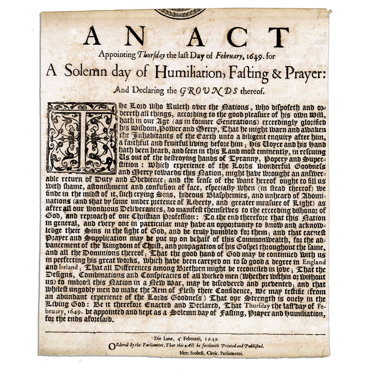 Broadside from the Third English Civil War, appointing the last day of February 1649 as a day of humiliation, fasting and prayer. Ordered by Parliament on 4 February 1649, a month after King Charles' beheading, it reads in part: ''…an opportunity to know and acknowledge their sins in the sight of God…his voyce and his hand…rescuing us out of the destroying hands of Tyranny, Poetry, and Superstition…'' Following King Charles I execution, Parliament ruled under Oliver Cromwell until the monarchy was restored in 1660. Measures 9'' x 11''. Toning and a small chip to the upper right corner with irregularly trimmed edges. Mounted to paper to an overall size of 11.25'' x 18.25''. Very good.
