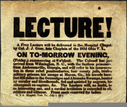 Broadside. "Lecture...in Hospital Chapel by Col. J.J. Geer, late Chaplain of the 183rd Ohio V.I...The Colonel has just arrived from Wilmington, N.C. with the footless prisoners from Andersonville, Georgia, and will refer to his incarceration in three rebel penitentiaries, four county jails, twelve military prisons, his escape at Macon, Ga., his travels barefoot 200 miles to the Ocomulgee and Altemaha Swamps, hunted by cavalry and bloodhounds, fed and assisted by negroes, his subsequent recapture, etc. The Lecture will, no doubt, be an interesting one, and a cordial invitation is extended to all, soldiers and citizens. Front seats reserved for ladies. U.S.A. Hospital, York, Pa., July 6, 1866." In bold lettering. 7 x 81/4. Fine. A splendid item: the prisons of the Civil War have been characterized as the "portals to Hell." While there were actually well over 1,000 sites which held prisoners, material relating to many of them is rare.