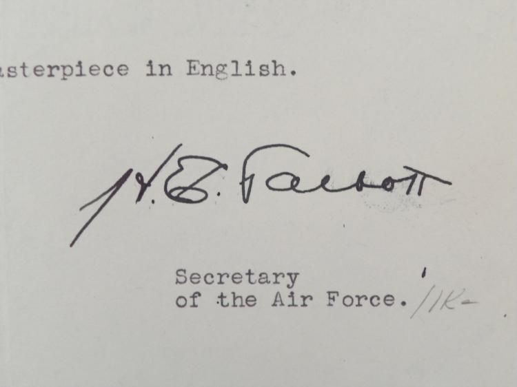 Offered here is a signed Broadside of Lincoln's Gettysburg Address signed by H.E. Talbot, the Secretary of the Air Force under Dwight D. Eisenhower. It comes in a protective sleeve and is in excellent condition, with a minor fold to the bottom right corner. *