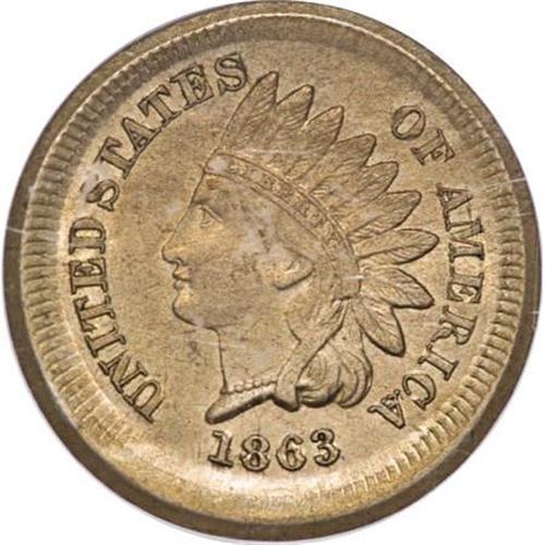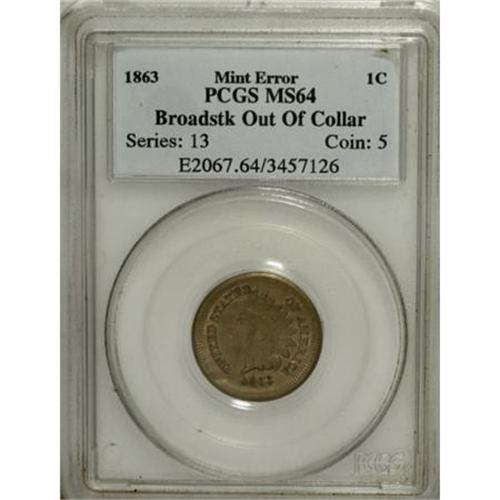 <B>1863 1C Indian Cent--Broadstruck Out of Collar--MS64 PCGS.</B></I> A well centered broadstrike with broad, lumpy rims and stretched peripheral legends, all as made because no collar was present to restrict expansion during the strike. The designs are sharply struck, also characteristic of a broadstrike. A satiny golden-brown mint error. Clean save for two concealed marks on the wreath near its left termination.<BR><BR><B>Coin Engraver:</B> James B. Longacre<BR><BR><b>Shipping:</b> Coins & Currency (<a target="_blank" href="http://www.heritageauctions.com/common/shipping.php">view shipping information</a>)
