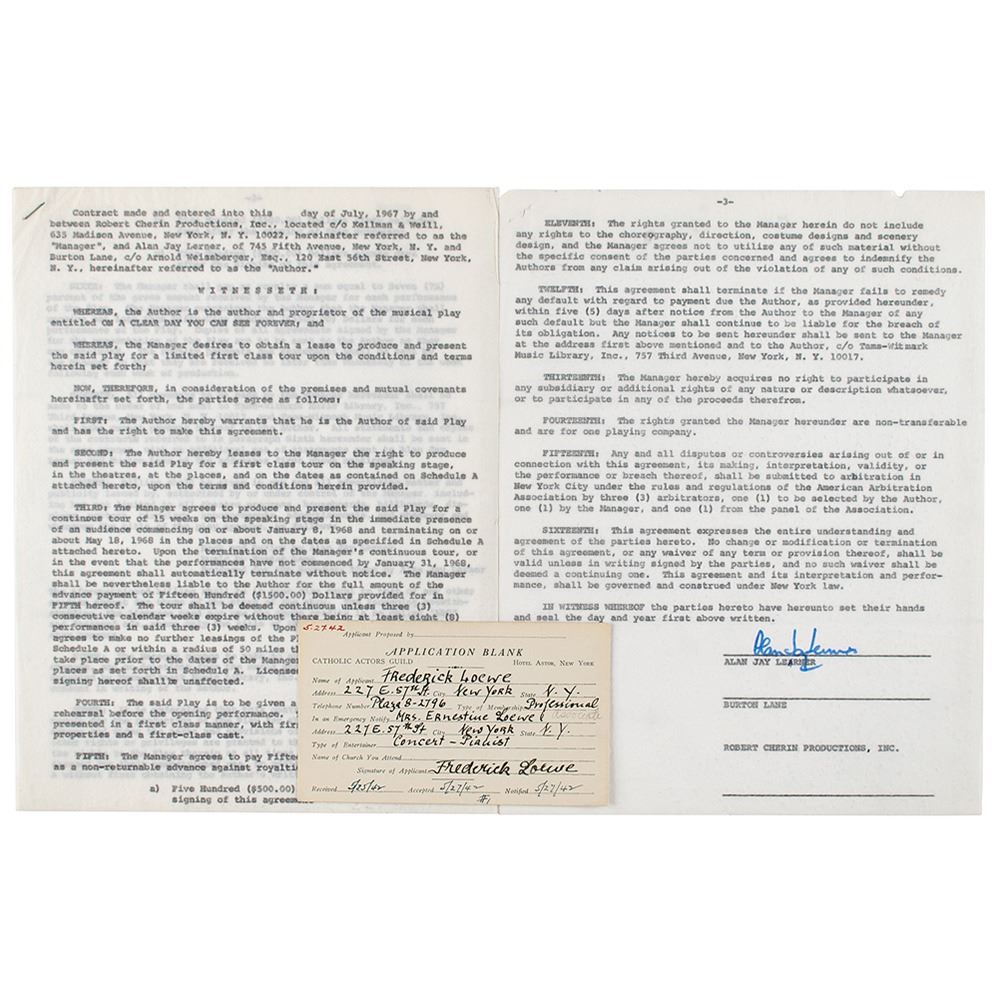 Three items signed by Broadway composers, including: a four-page agreement for a live TV presentation of the George Gershwin musical Oh Kay on NBC in 1951, signed in ink by collaborators P. G. Wodehouse and Ira Gershwin (twice, once for the "Estate of Rose Gershwin"), as well as Arthur Gershwin and producer Bernard L. Schubert; a two-page contract between Robert Cherin Productions and Alan Jay Lerner to take his "musical play entitled On A Clear Day You Can See Forever" on a 15-week tour in 1967, signed at the conclusion in felt tip by Lerner; and an application card for membership in the Catholic Actors Guild, May 27, 1942, filled out in the hand of Frederick Loewe and signed by him at the conclusion. In overall fine condition.