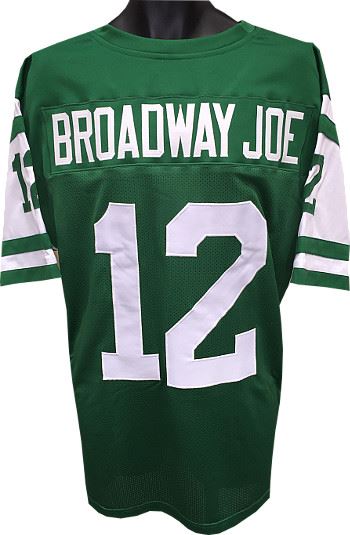 This is a new, in stock, Broadway Joe Namath unsigned Throwback green unlicensed prostyle jersey with fully stitched twill numbers on the front and back and players name plate, there are NO LOGOS, TAGS, BRAND NAMES or PATCHES ON THIS JERSEY & IS NOT A OFFICAL LICENSED JERSEY, 100% polyester. This is perfect for autographs, to wear or as a collectible. Size XL (48/50)