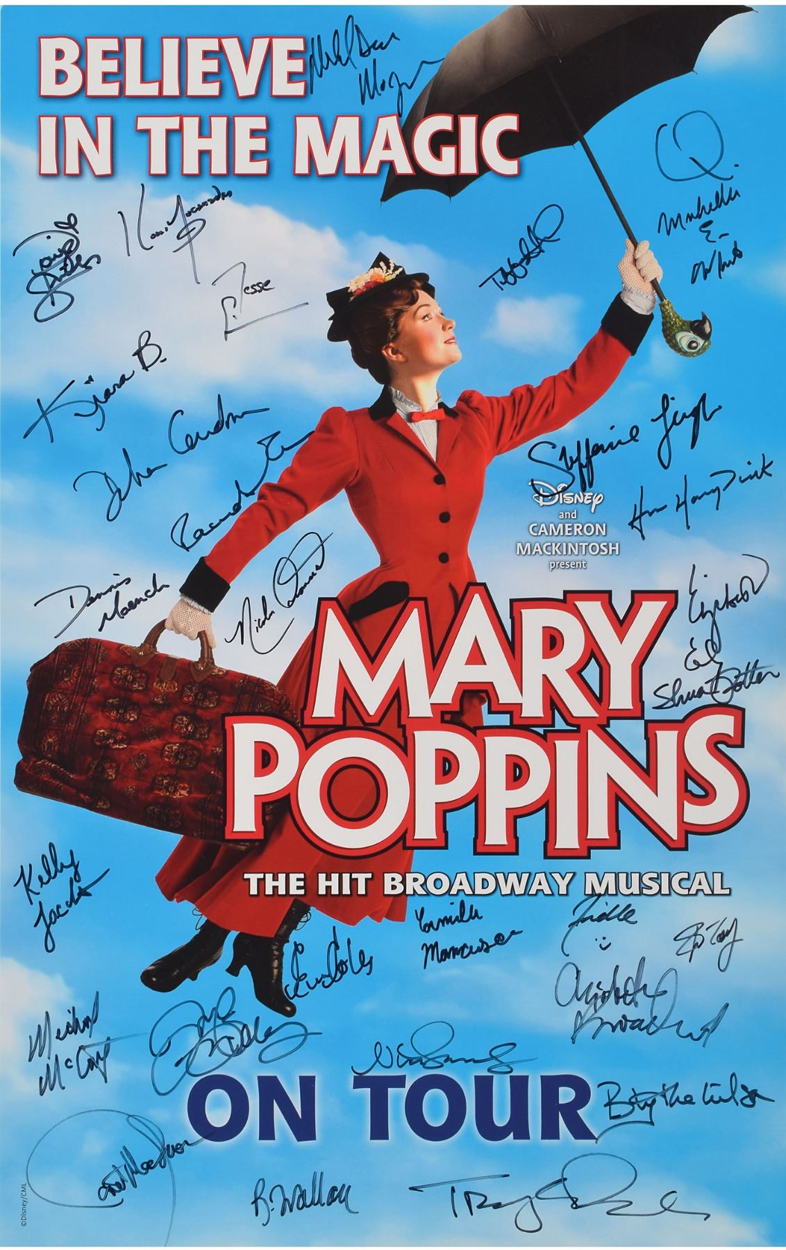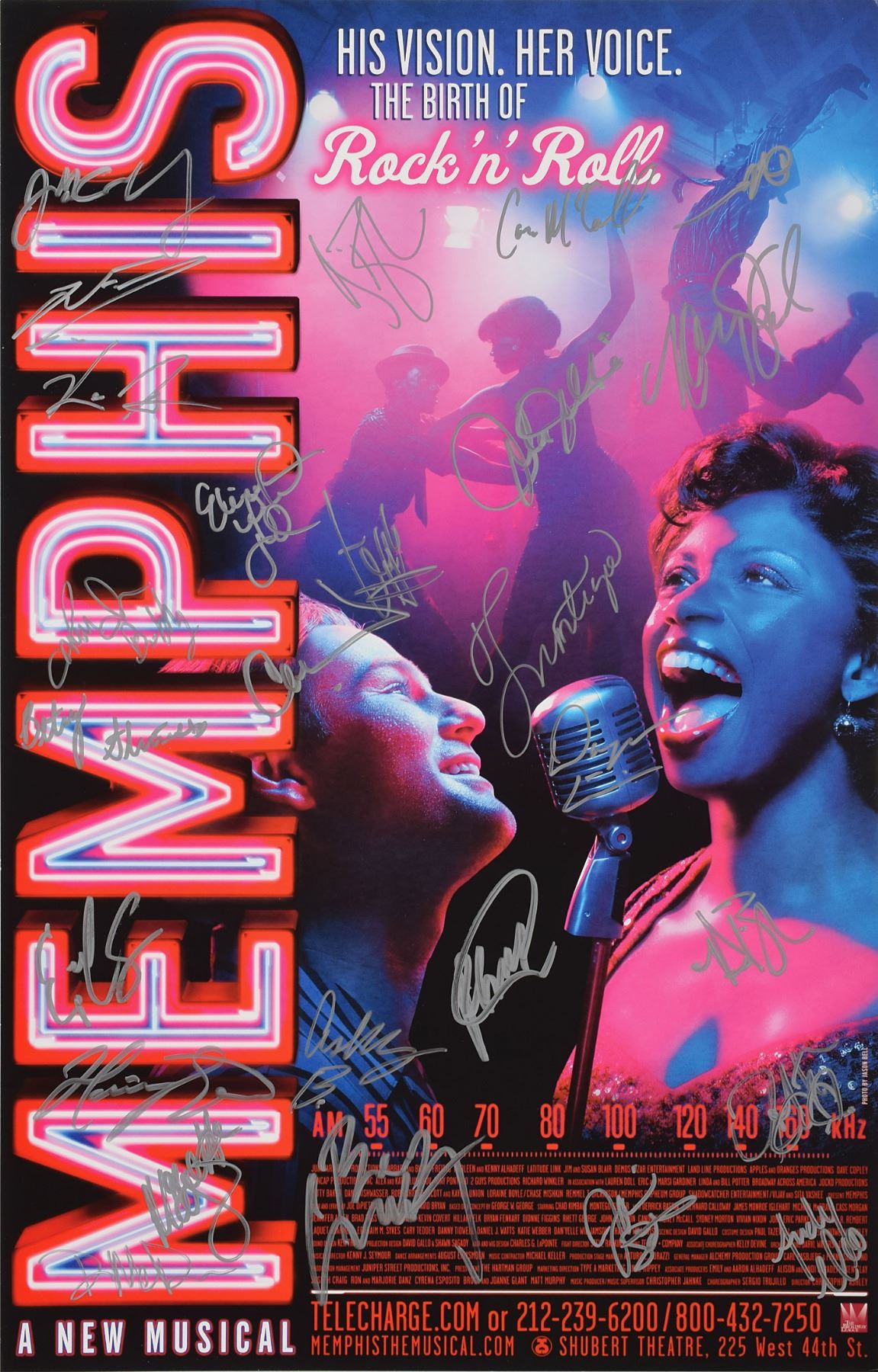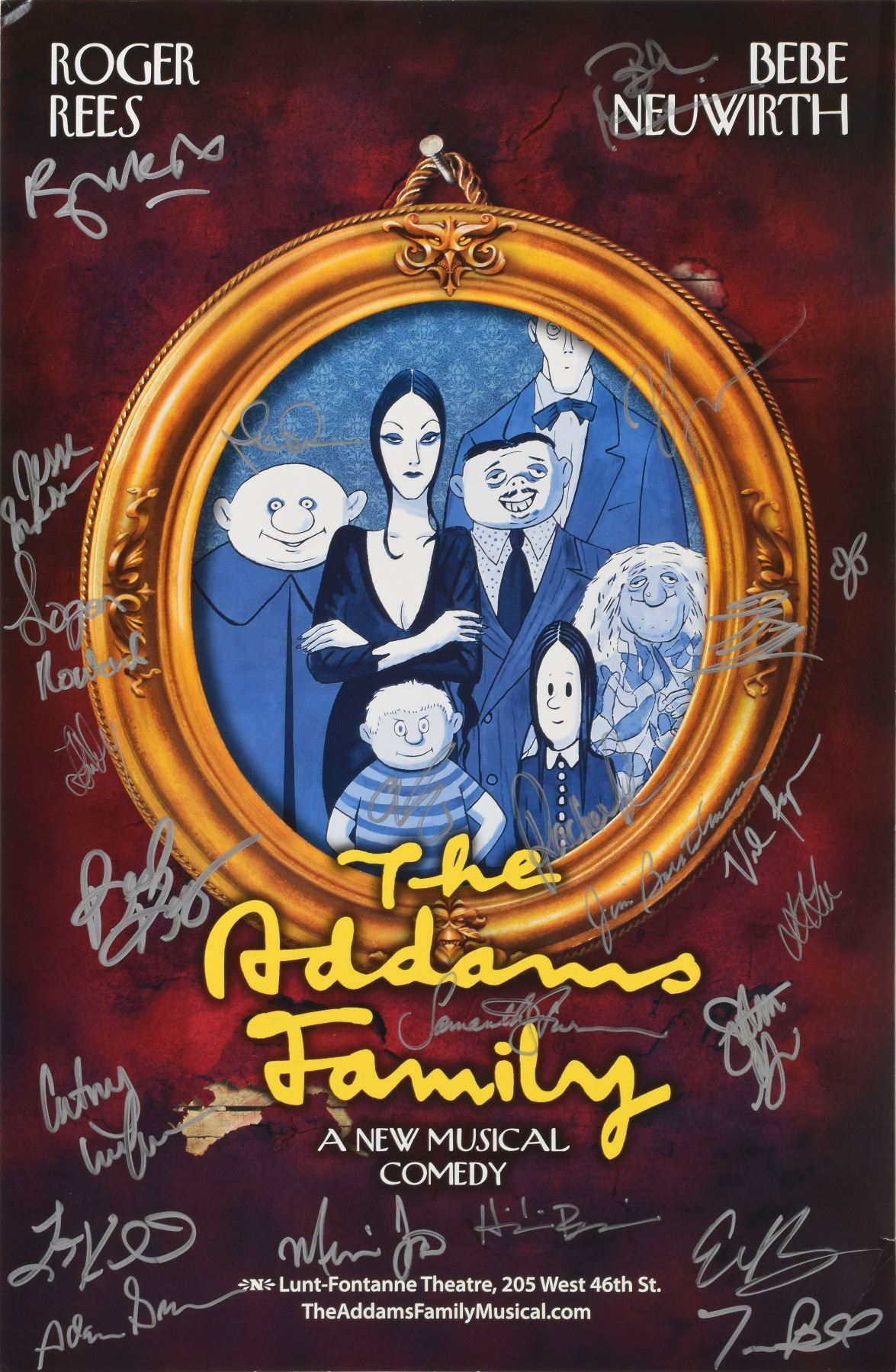 Collection of ten posters for various Broadway shows, ranging in size from 14 x 22 to 20 x 30, each signed in ink or felt tip by numerous cast members. Productions include: The Addams Family, All Shook Up, La Cage Aux Folles, Mary Poppins, Memphis, The Phantom of the Opera, The Philanthropist, Rock of Ages, That Championship Season, and The Wiz. The Philanthropist poster is affixed to a same-size foamcore mount. In overall fine condition, with a few mild corner tip dings.