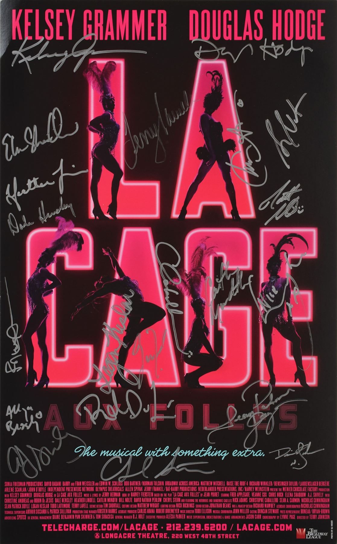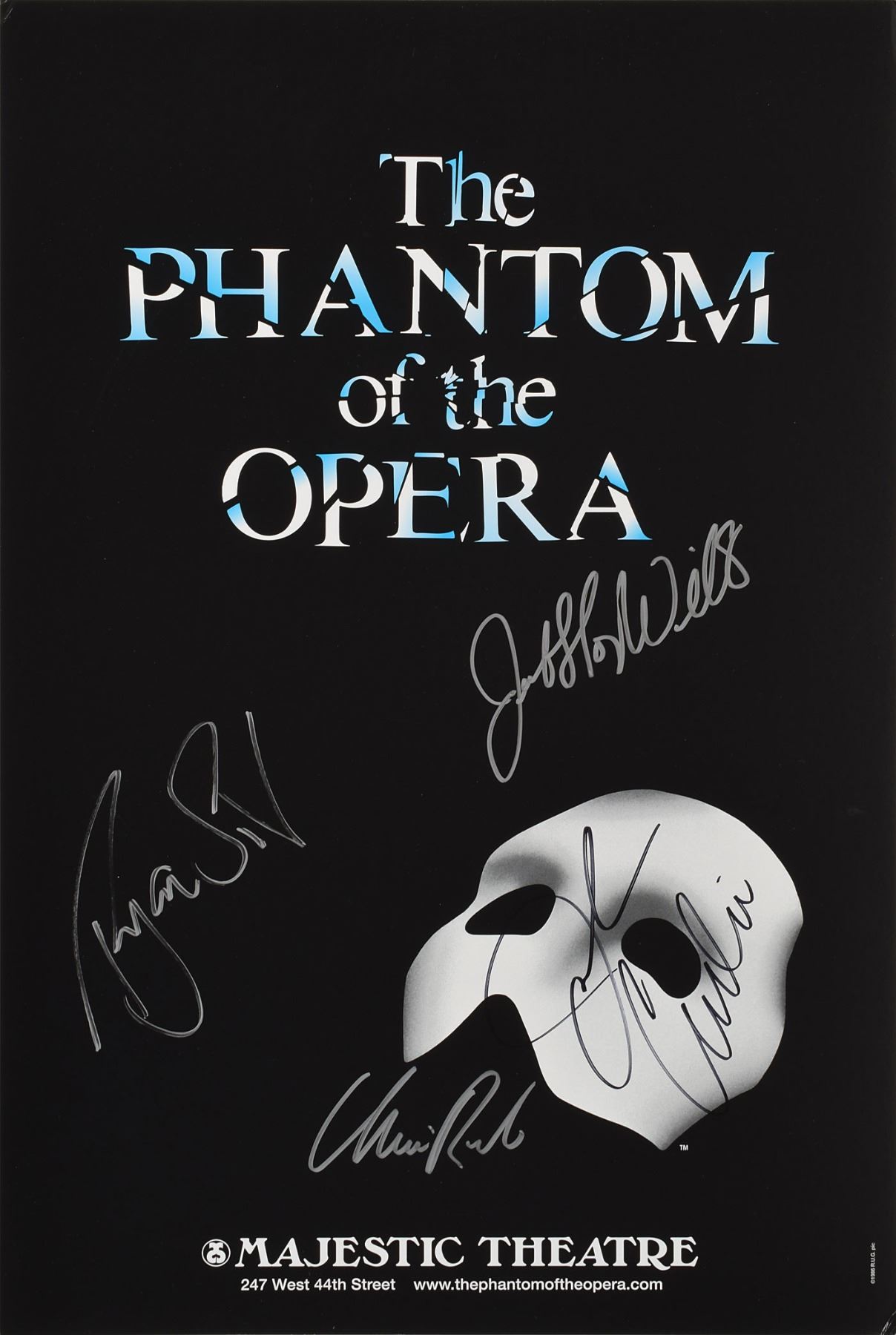Collection of ten posters for various Broadway shows, ranging in size from 14 x 22 to 20 x 30, each signed in ink or felt tip by numerous cast members. Productions include: The Addams Family, All Shook Up, La Cage Aux Folles, Mary Poppins, Memphis, The Phantom of the Opera, The Philanthropist, Rock of Ages, That Championship Season, and The Wiz. The Philanthropist poster is affixed to a same-size foamcore mount. In overall fine condition, with a few mild corner tip dings.