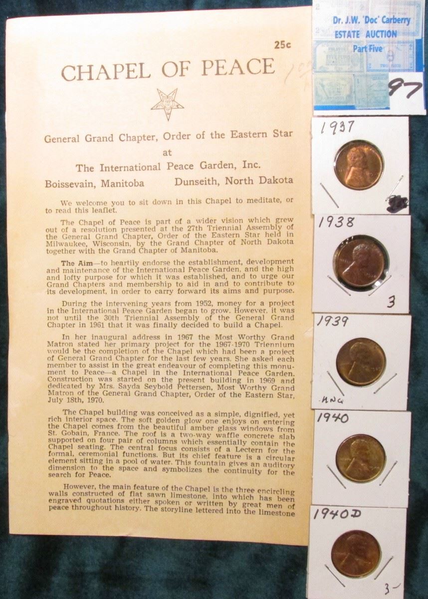 Brochure: "Chapel of Peace General Grand Chapter, Order of the Eastern Star at The International Peace Garden, Inc. Boissevain, Manitoba Dunseith, North Dakota"; & 1937P, 38P, 39P, 40P, & D BU to Red BU Lincoln Cents.