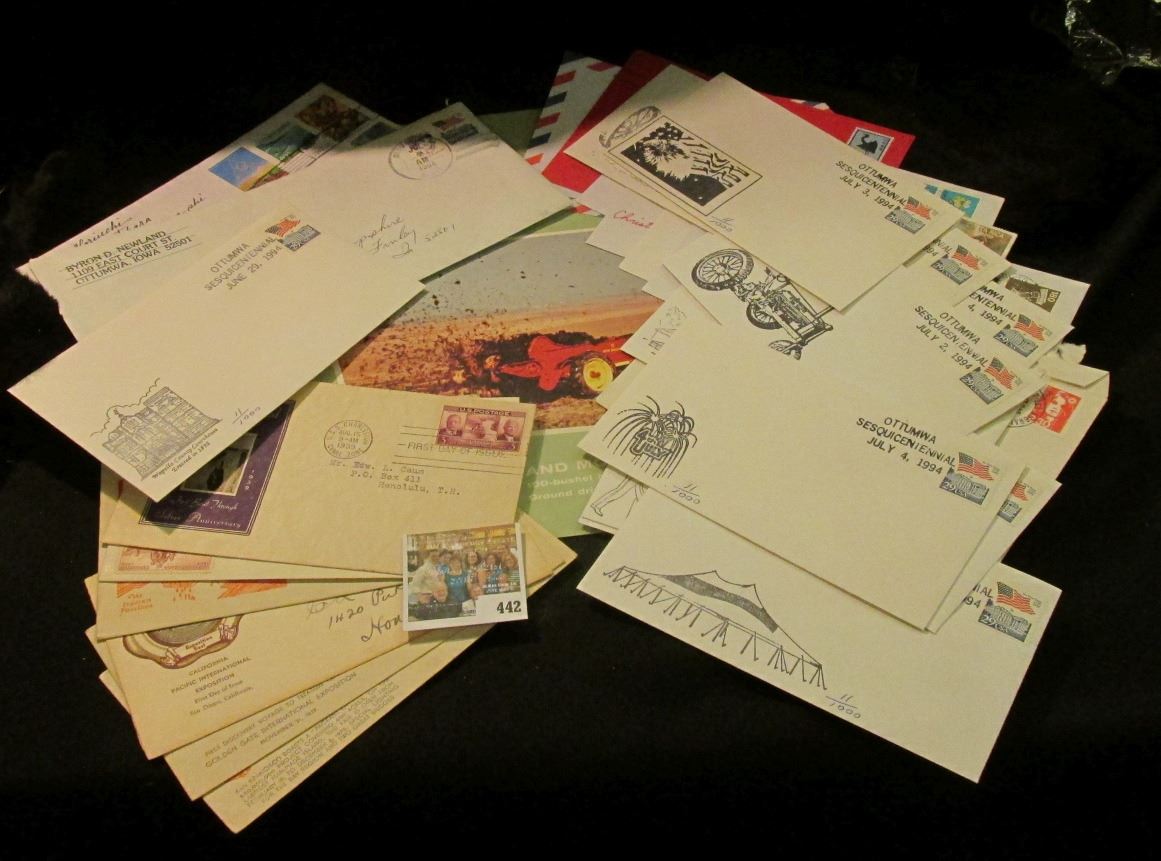 Brochure "New Holland Model 200 and Model 220 100-bushel Manure Spreader Ground Drive and p.t.o."; (5) 1930 era First Day of Issue Stamped Covers including 1939 Golden Gate International Exposition, California Pacific International Exposition, 1933 Century of Progress Italian Day Cover, & 1939 Panama Canal Zone; Japanese Stamped Cover; (12) "Ottumwa Sesquicentennial 1994" Stamped Souvenir Covers; & much more.