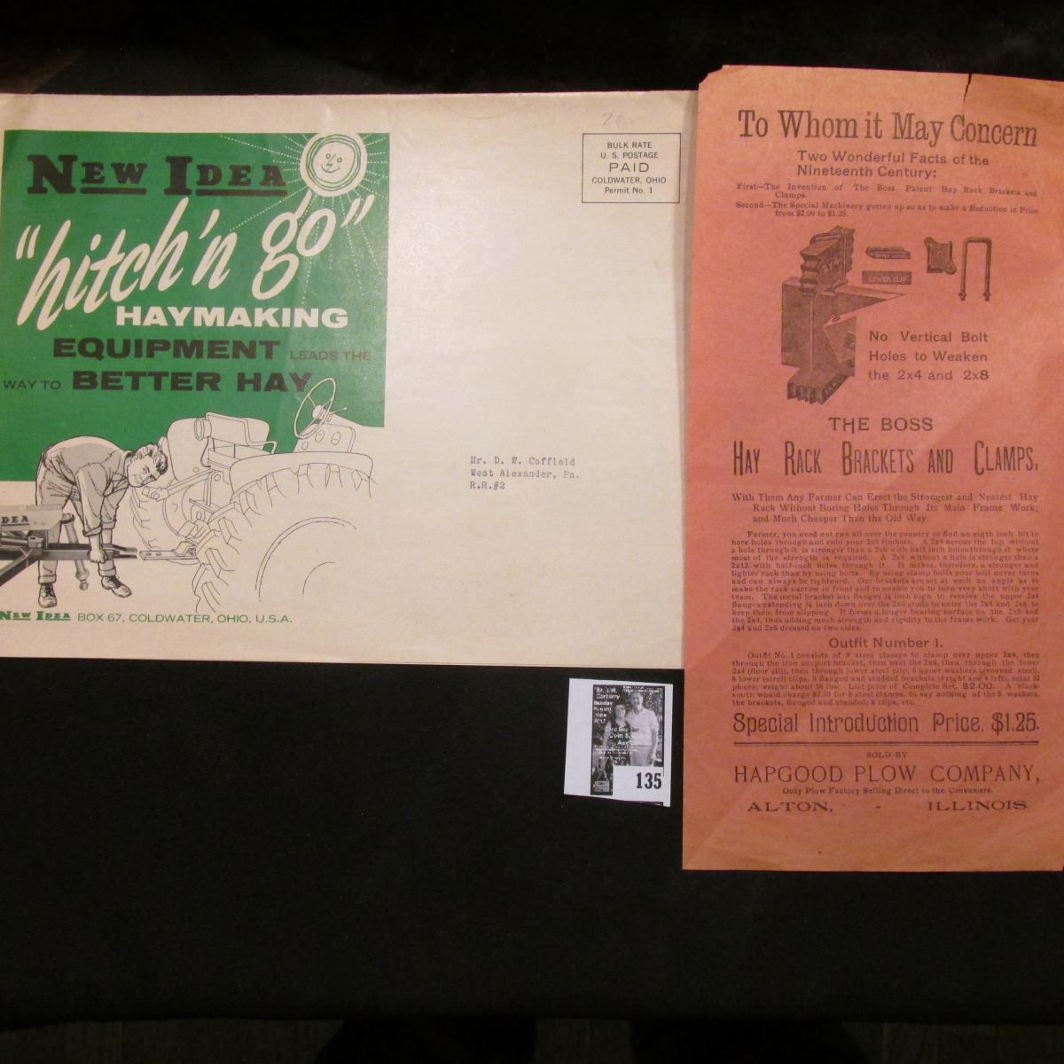 Brochure "To Whom it May Concern…The Boss Hay Rack Brackets and Clamps,…Sold By Hapgood Plow Company…Alton, Illinois"; mint envelope "New Idea "hitch'n go" Haymaking Equipment Leads the Way to Better Hay"; & brochure "Philip Smith, Manufacturer of the Miami Valley Corn Sheller...Sidney, Ohio, U.S.A."