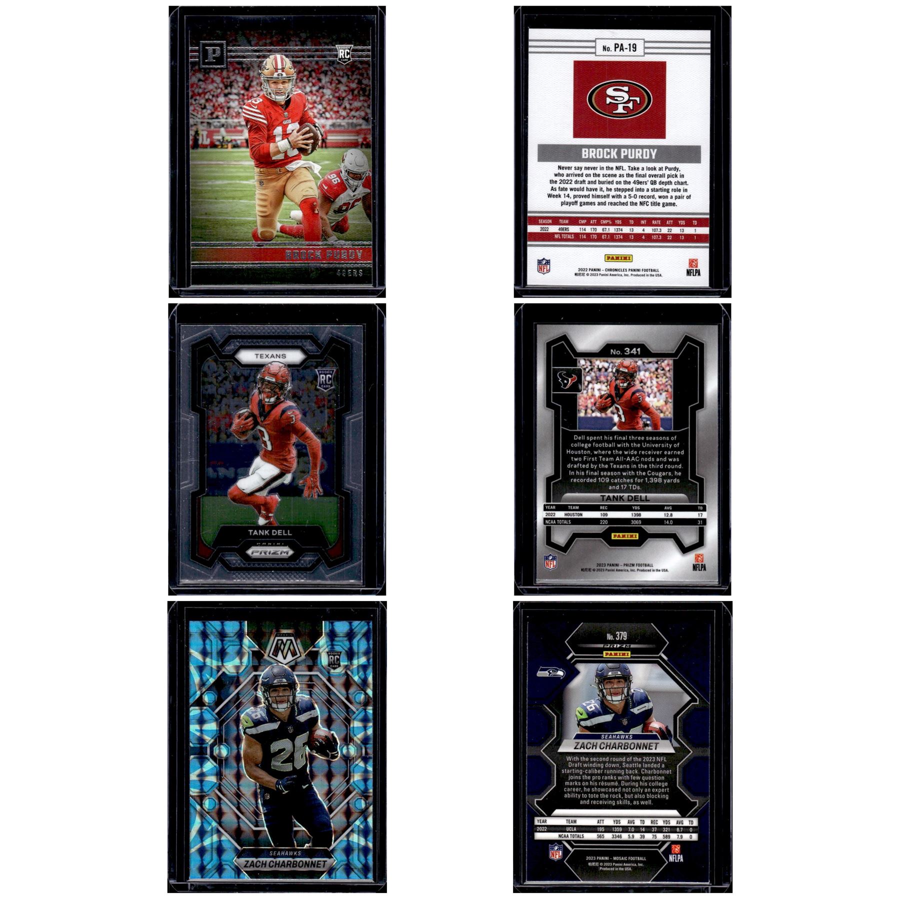 Brock Purdy ROOKIE CARD 2022 Panini Chronicles Panini #PA-19, Tank Dell ROOKIE CARD 2023-'24 Panini Prizm #341, & amp; Zach Charbonnet ROOKIE CARD 2023-'24 Panini Mosaic Blue Reactive Prizm Mosaic #379.