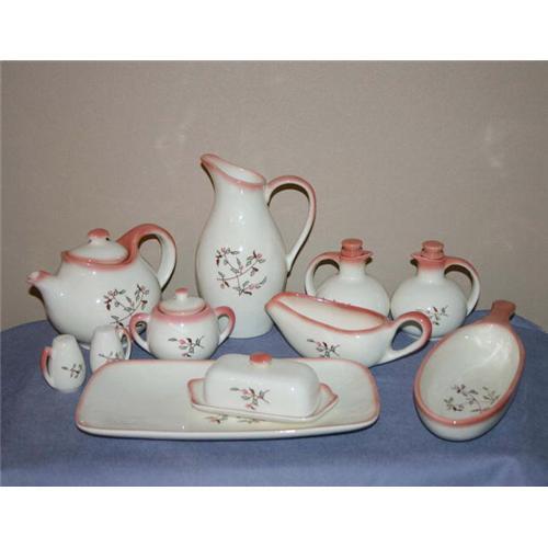 This is the PERFECT Dinnerware to complete your new 1950s Kitchen decor! Gorgeous Vintage 1950s California Pottery complete and unused 82 piece Brock of California Pottery in their fabulous Wildflower pattern. It looks like someone put them in a china cabinet and never used them; not a scratch! There are 12 place settings, with 6 pieces in each set consisting of a Dinner Plate,Bread Plate Soup Bowl, Fruit Bowl and Teacup with Saucer. There are also 10 serving pieces.The Dinner Plate measures 11 inches, the Bread Plate 6 3/4 inches, the Soup Bowl 6 3/4 inches, the Fruit Bowl 5 1/2 inches and the Cup & Saucer 6 1/2 inches. The serving pieces consist of a Tea Pot measuring 6 3/4 inches tall and 9 inches long, Oil & Vinager Cruet Set 5 1/4 inches tall, Water Pitcher 9 1/4 inches tall, Vegetable Dish 10 inches x 4 1/2 inches, Bread Plate 6 3/4 inches x 13 inches, Covered Butter Dish 6 1/2 inches long, Salt & Pepper 2 1/2 inches and a gorgeous Creamer with covered Sugar Bowl standing 3 1/4 inches tall. Priced individually this set would sell for well over 1,500 dollars!! All 82 pieces in this fabulous Vintage Wildflower Dinnerware Set by Brock are mint, shinny and absolutely superb!This is a rare opportunity to own this fabulous and complete Dinnerware set.For serious inquires, we have many more photos of this wonderful set that we would be happy to e-mail to you.