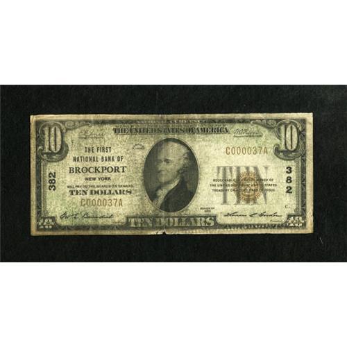 <B>Brockport, NY</B></I> - $10 1929 Ty. 1 <B>The First NB</B></I> Ch. # 382<BR> Sixteen small size notes are known including this well circulated, lightly wallet stained example. <B>Good-Very Good</B></I>.<BR><BR><b>Shipping:</b> Coins & Currency (<a target="_blank" href="http://www.heritageauctions.com/common/shipping.php">view shipping information</a>)