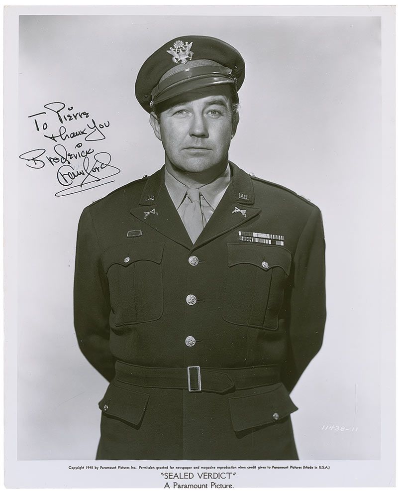 Vintage glossy 8 x 10 publicity photo of Broderick dressed in an Army suit from 1948’s Sealed Verdict, signed and inscribed in-person in black fountain pen “To Pierre, Thank You, Broderick Crawford.” In fine condition, with some scattered light surface impressions, light corner tip creasing, and a tiny bit of ink between first and last name.