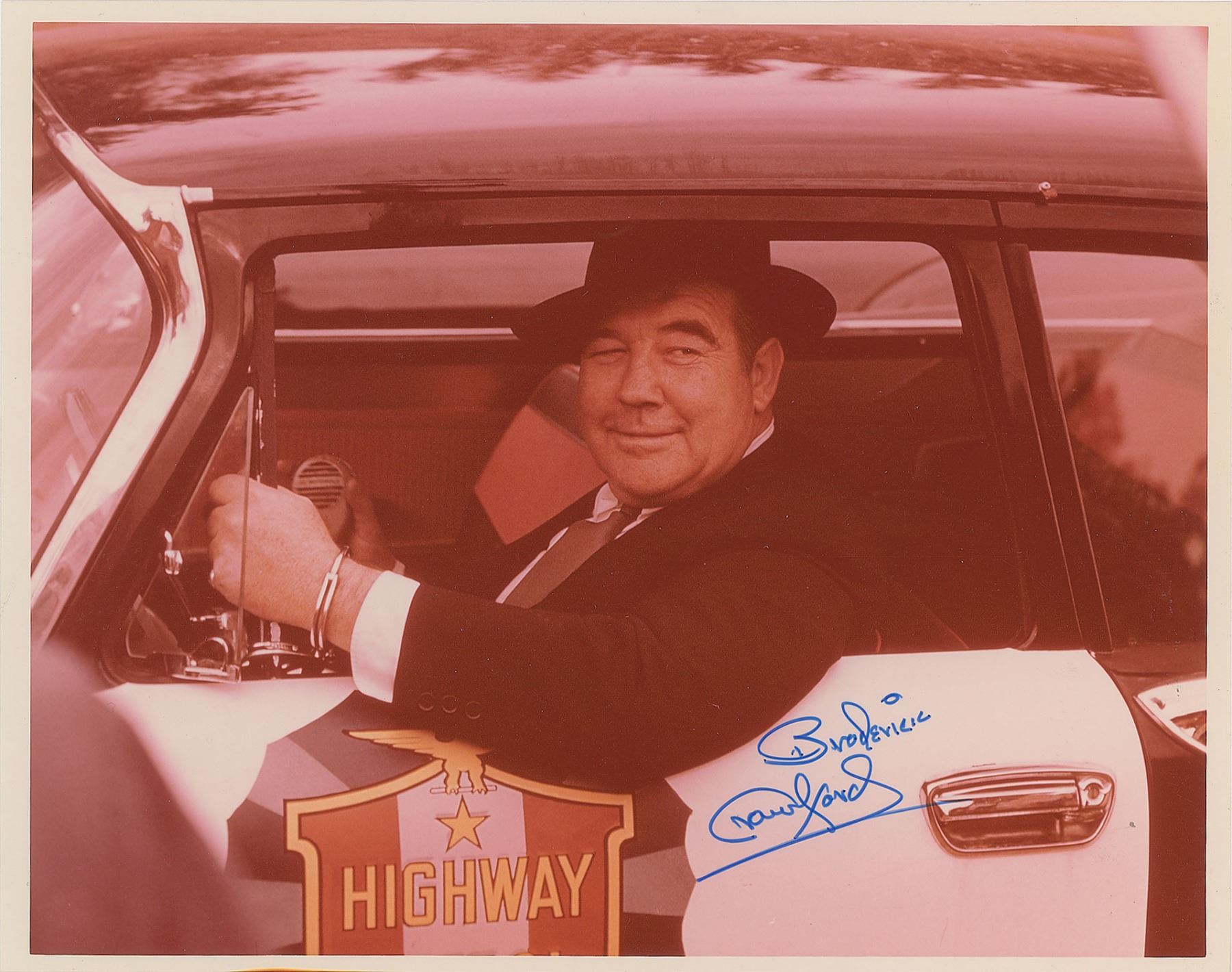 Color glossy 10 x 8 photo of Crawford in Highway Patrol, handcuffed and on the radio, signed in blue felt tip. In fine condition.